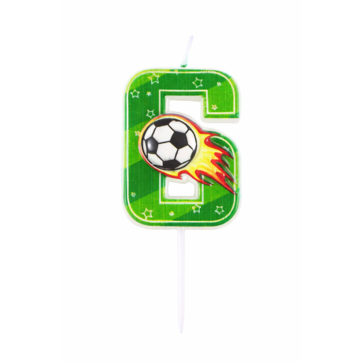 Si estás preparando un cumpleaños para un pequeño apasionado del fútbol, esta Vela De Cumpleaños Número 6 con diseño deportivo es el detalle perfecto para coronar la tarta. El número aparece decorado con un balón en pleno movimiento y un efecto de velocidad que aporta un toque dinámico y muy divertido a la celebración.