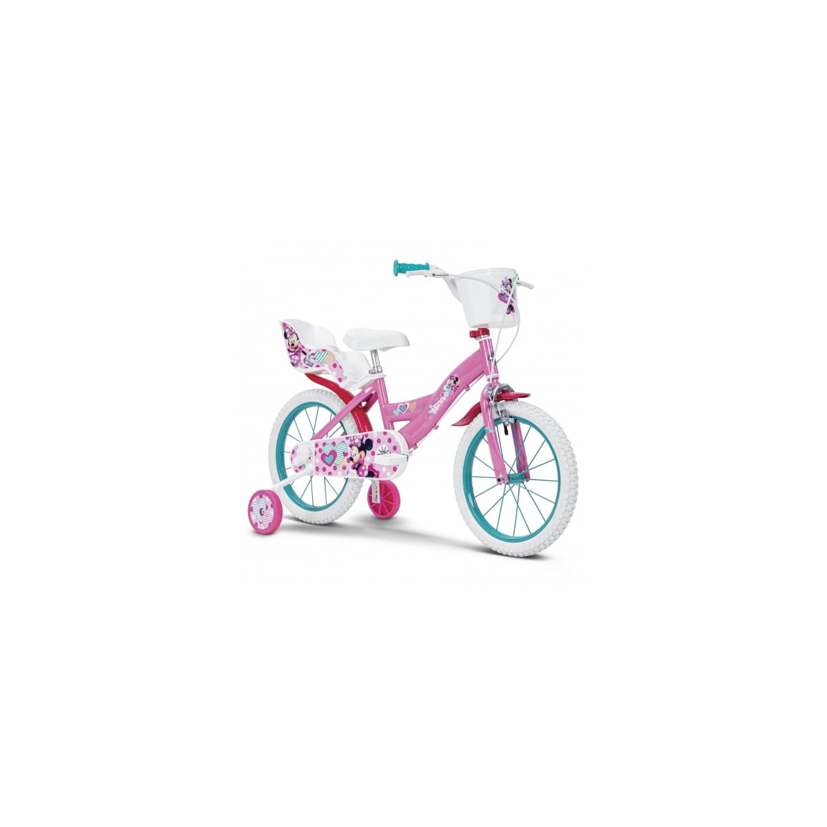 Una bicicleta de 14" con estampado de Minnie Mouse. Los ruedines hacen que esta bici sea perfecta para principiantes. El sillín se puede regular, para adaptarla al crecimiento de los peques. Incluye una sillita para poder llevar muñecos en la parte trasera y una cesta en la parte delantera.