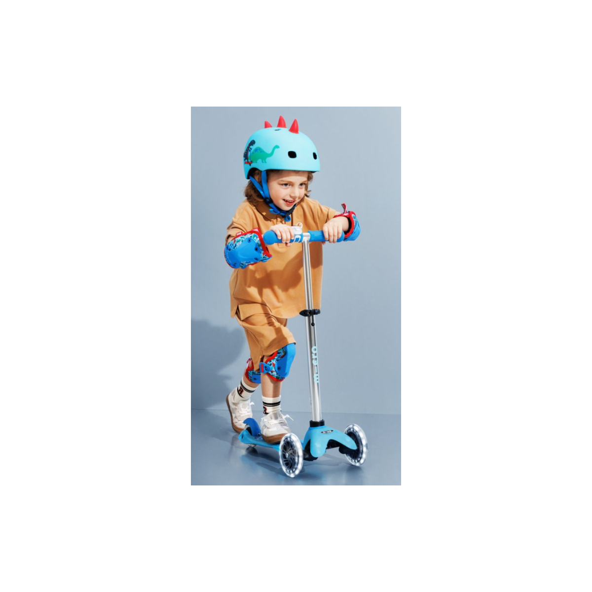 Descubre el Set Rodilleras Y Coderas Dinosaurio; protección cómoda y ajustable para niños y niñas en patinete, bici o skate.