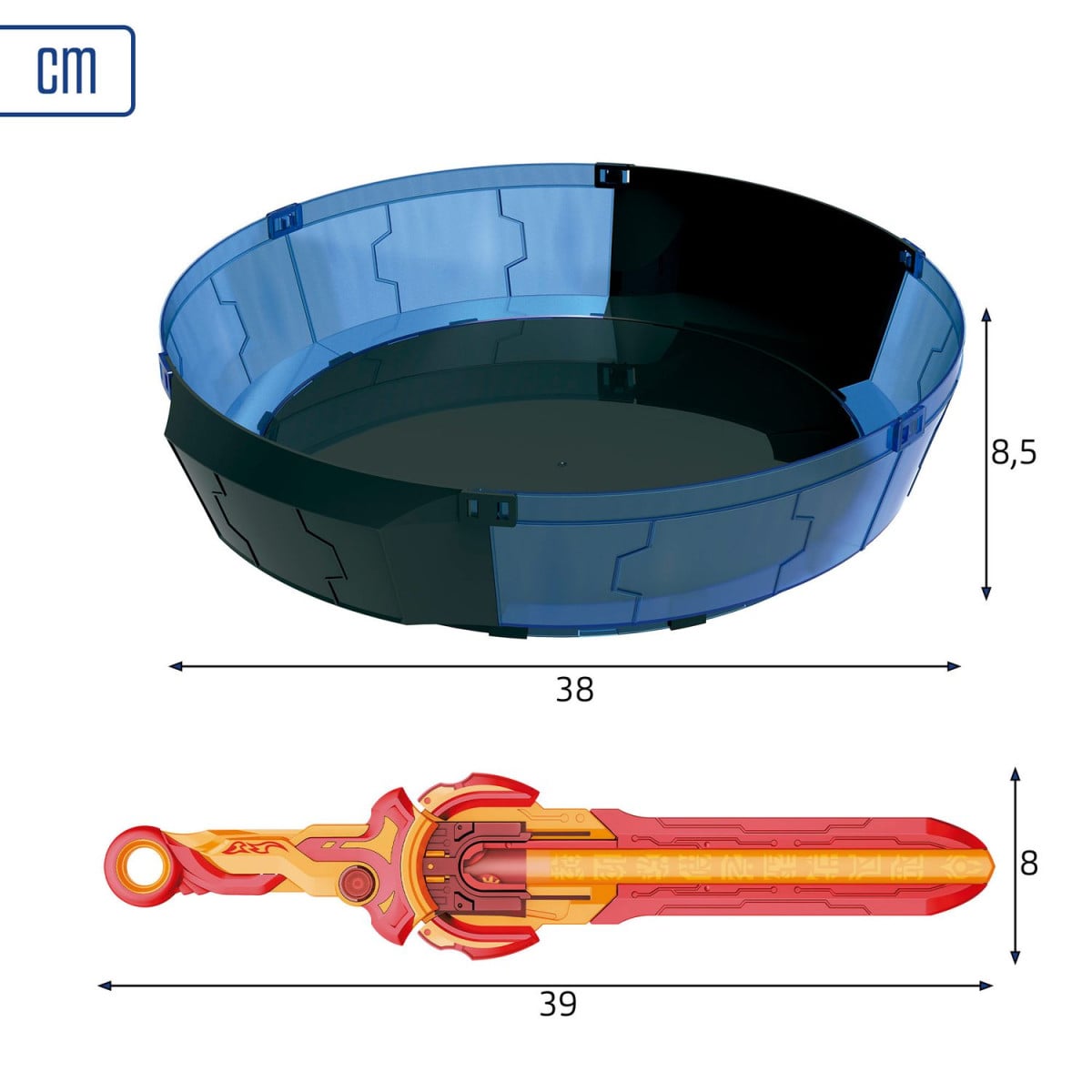 Este set incorpora un estadio de batalla, donde las peonzas competirán entre sí, junto con 2 peonzas Nado (equilibrio y ataque) y 2 lanzadores en forma de espada, que permiten realizar lanzamientos potentes y precisos. Solo tienes que cargar la peonza, accionar el lanzador y… ¡que comience la batalla!