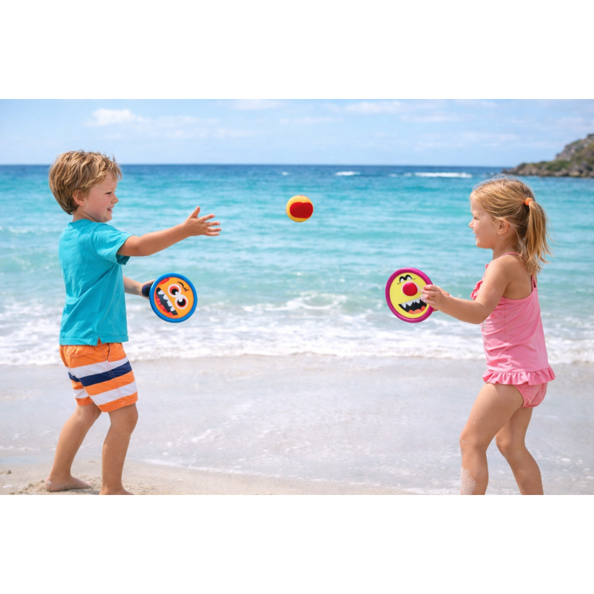 Set de palas de playa con 2 palas y pelota blanda, con divertidos diseños. Perfecto para jugar al aire libre, fomentar el ejercicio y disfrutar en la playa o parque en familia.