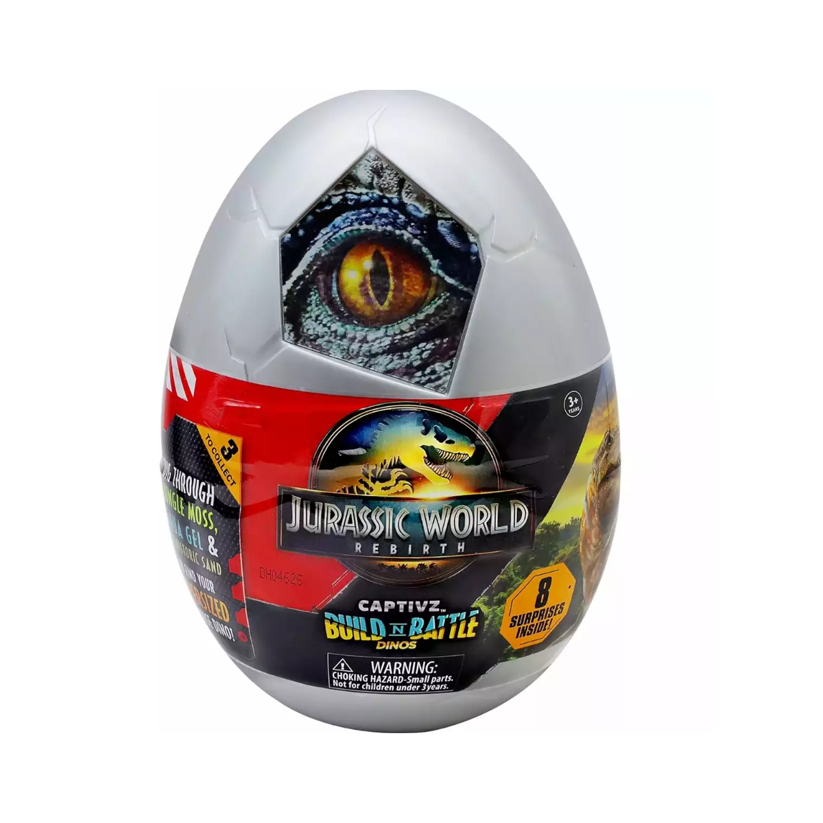 ¡Explora el mundo jurásico con este increíble huevo sorpresa de Jurassic World Captivz Build N Battle Dinos! Dentro de este gran huevo se esconden 8 sorpresas, entre las que se incluyen figuras de dinosaurio, slime con textura viscosa, cartas coleccionables y elementos sorpresa para montar y jugar. Toda la emoción de Jurassic World, ahora en la palma de la mano.