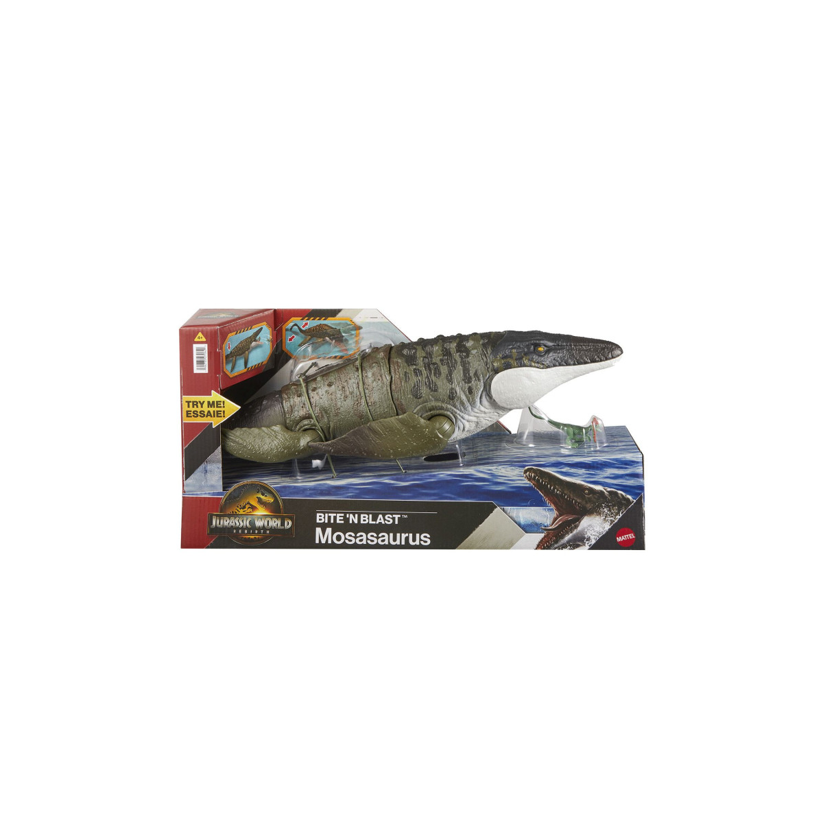 Descubre el Jurassic World Mosasaurio Mordedor; enorme, articulado, come y escupe al dilofosaurio, con AR integrado para una experiencia jurásica total.