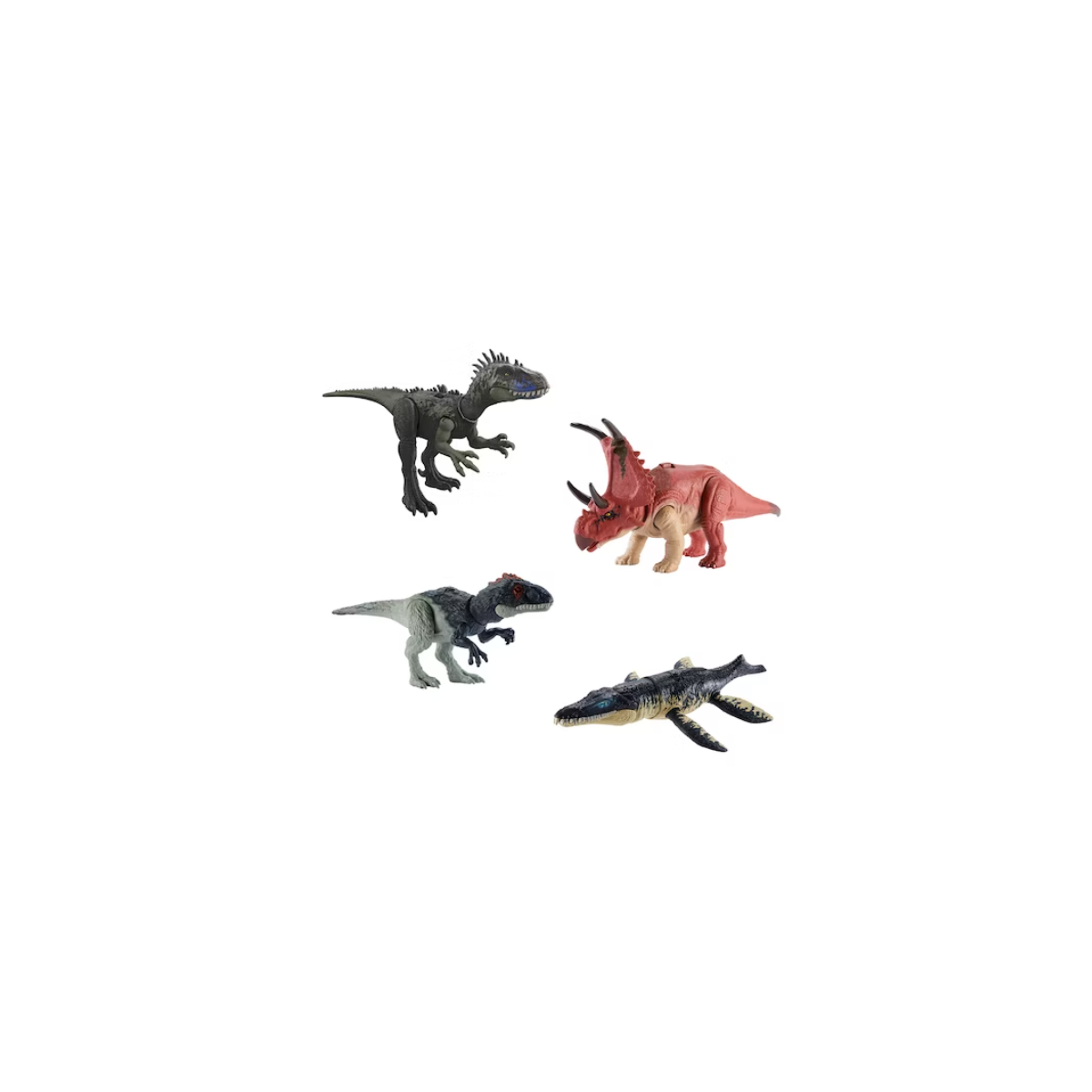 - Incluye: 1 figura de dinosaurio articulado con 2 movimientos de ataque (latigazos, mordiscos, estiramiento de cuello, etc) y seguimiento de Jurassic World con sonidos de rugidos por modelo