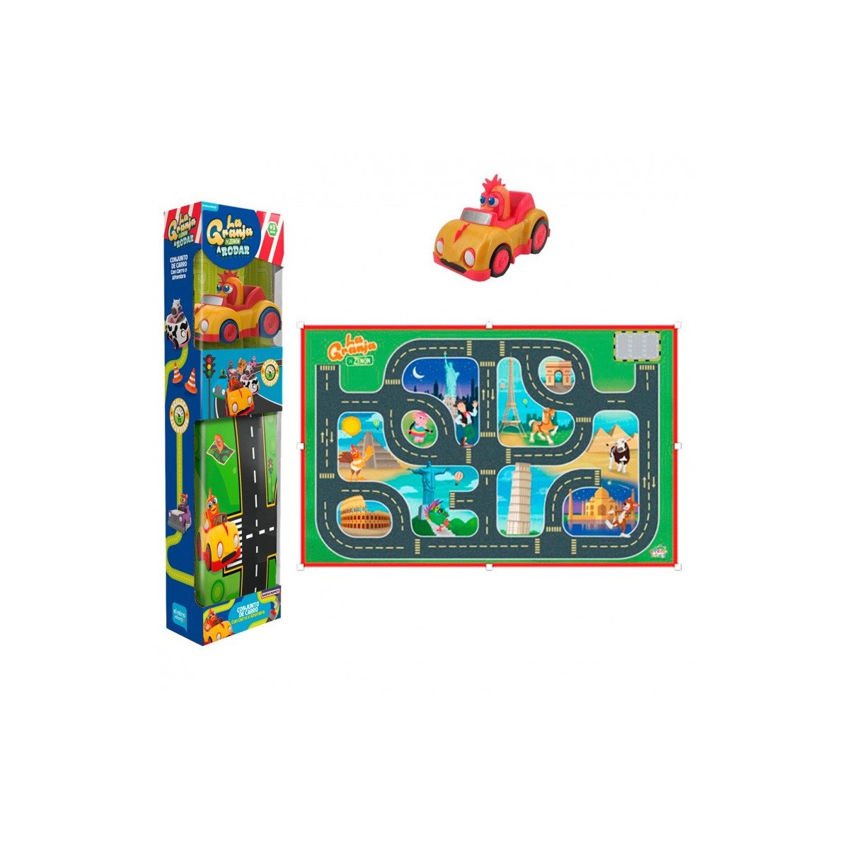 Los peques lo pasarán genial cobre la suave y con dibujos de carretera Alfombra + Coche del gallo Bartolito de La Granja De Zenón.