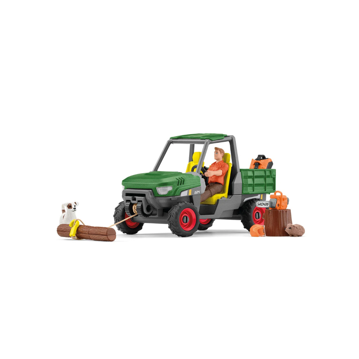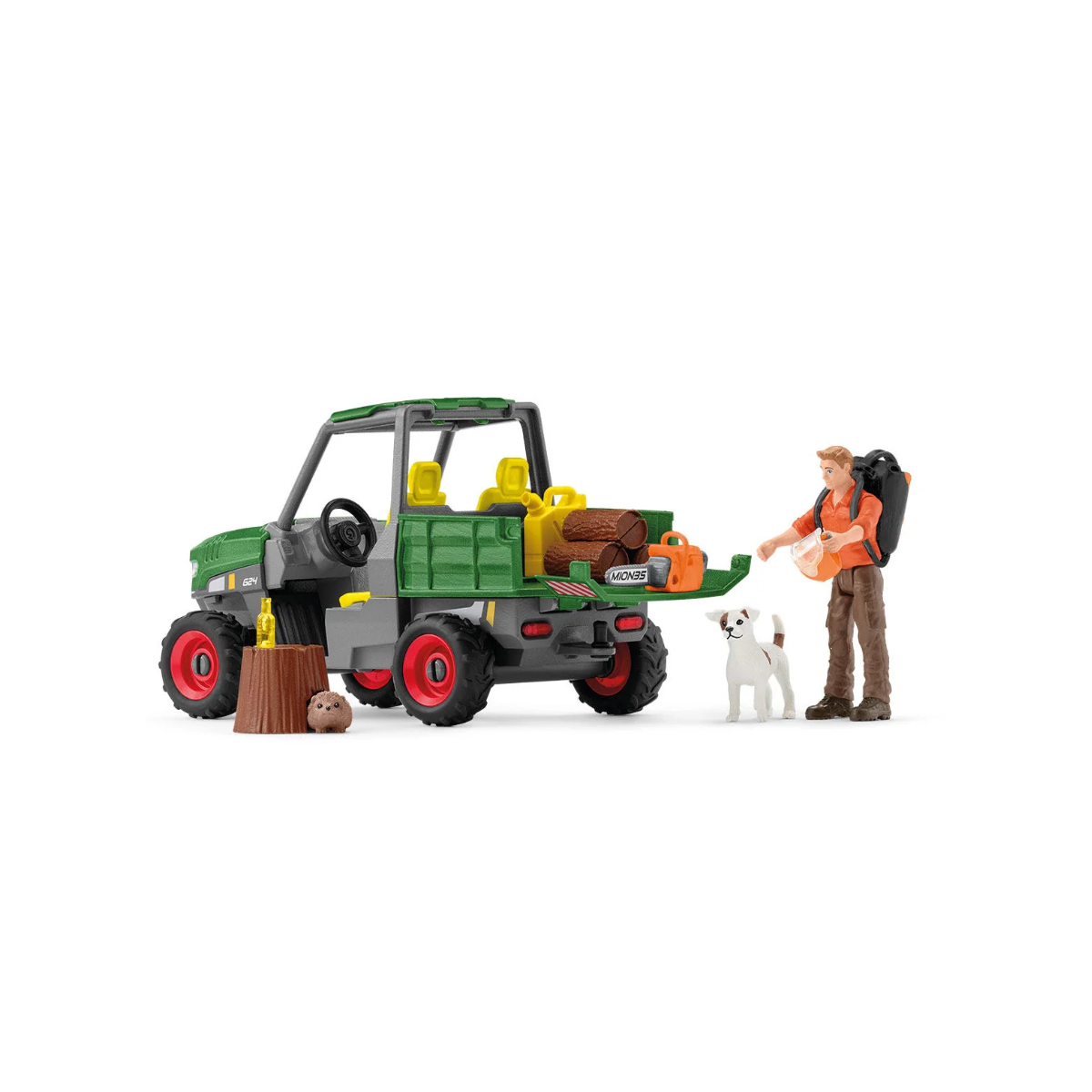 Este completo set Granjero Con Vehículo del mundo FARM WORLD pone en escena al granjero Paul que, preparado con casco y botas, llega al bosque con su vehículo todoterreno para cortar troncos y cargar madera. Incluye figuras y accesorios como un Jack Russell Terrier, un erizo curioso que aparece desde un arbusto, y elementos como motosierra, bidón de reserva y palés de madera que enriquecen el juego con detalles de la vida agraria.