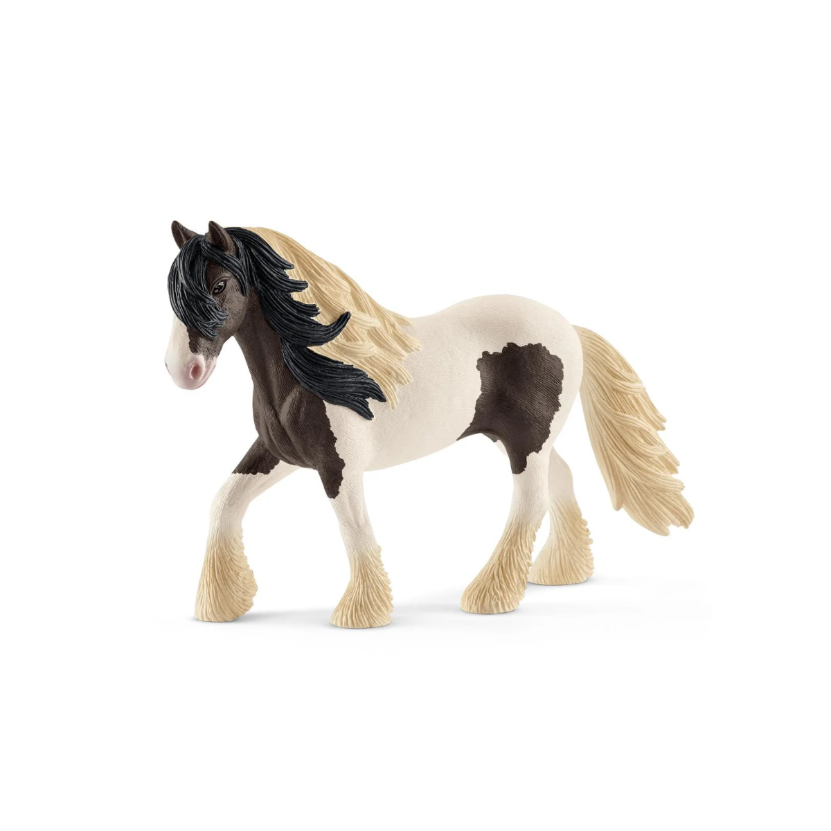 La figura de Schleich está modelada con especial atención en los detalles: la textura de la crin, el volumen del cuerpo y las manchas bien definidas aportan un realismo que invita a mirarlo desde todos los ángulos. El Semental Tinker es perfecto para recrear escenas de campo abierto, paseos relajados o historias donde la conexión entre caballo y jinete es protagonista.