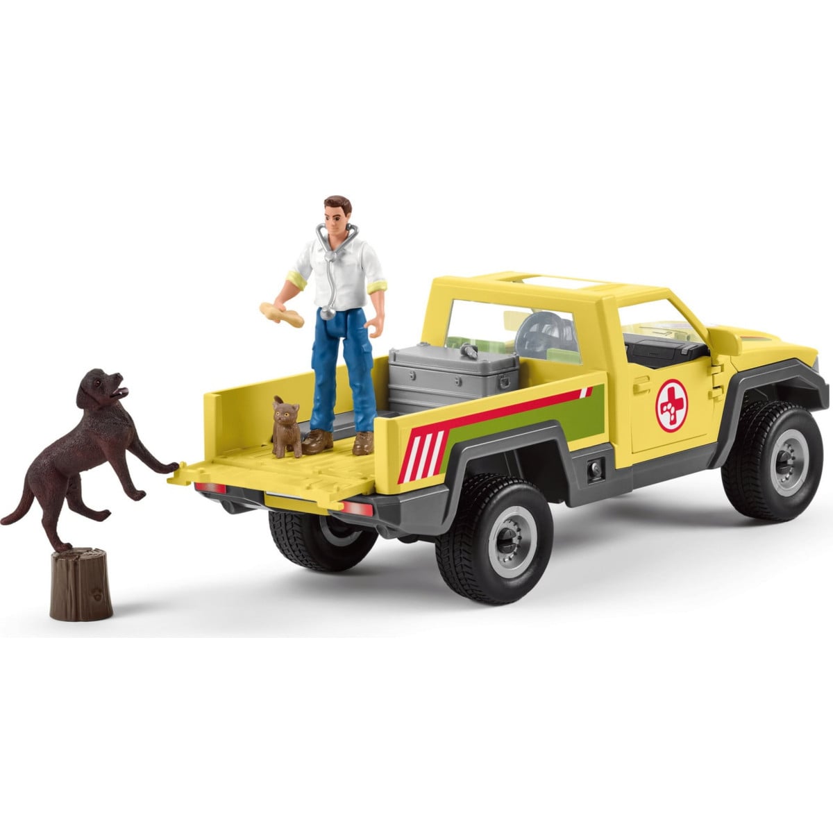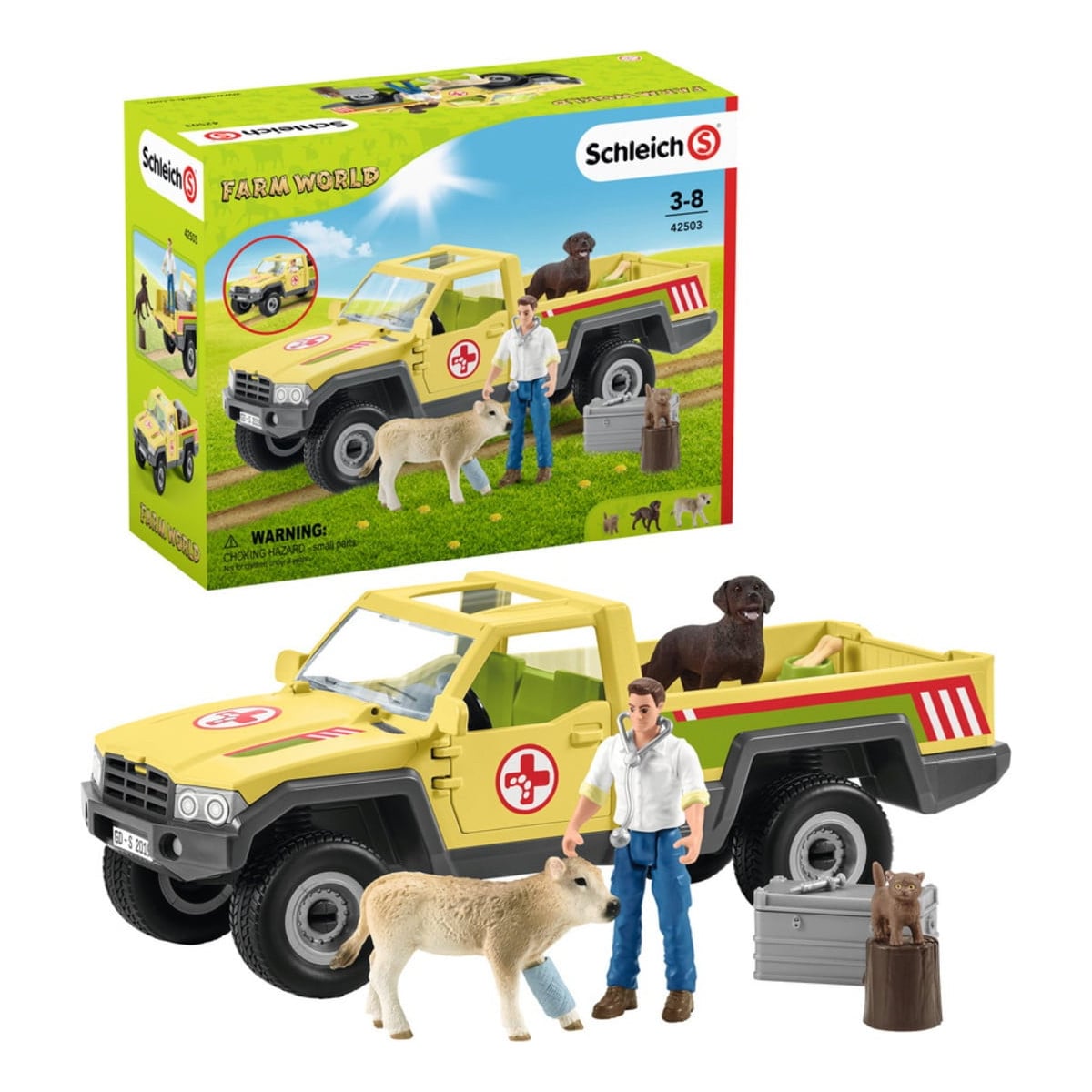 - Incluye: 1 camioneta con rampa de carga abatible, 1 figura de veterinario con brazos y piernas móviles, 1 ternero, 1 labrador retriever y 1 gatito.