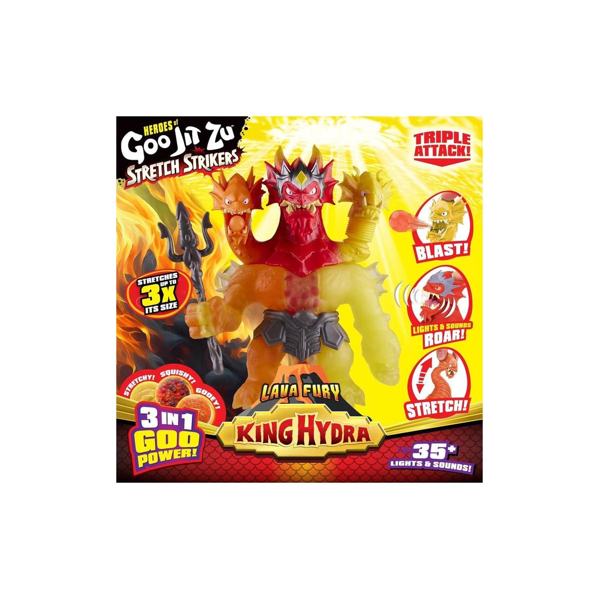 Figura Goo Jit Zu Lava Fury King Hydra con triple relleno y cabezas funcionales, luces y sonido. Perfecta para recrear épicas batallas y aventuras.