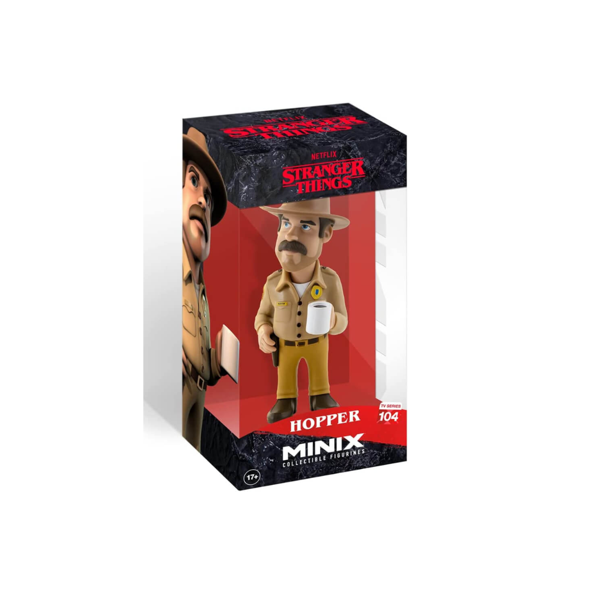 Esta figura representa a Hopper con su clásico uniforme de sheriff, sombrero y su inseparable taza de café, un detalle que refleja perfectamente su personalidad tranquila pero siempre alerta. El diseño mantiene el estilo estilizado característico de las figuras Minix Collectible Figurines, con rasgos reconocibles del personaje y un acabado muy cuidado.