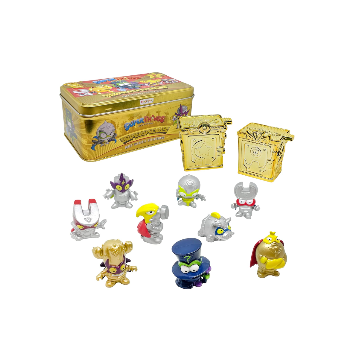 Dentro de la lata se incluyen figuras doradas, plateadas y personajes exclusivos de la Serie 7, imposibles de encontrar en los sobres individuales. En total, encontrarás una selección de 11 SuperThings, entre ellos 2 dorados exclusivos, 6 plateados y 1 personaje especial. Una oportunidad única para completar su colección con figuras difíciles de conseguir.