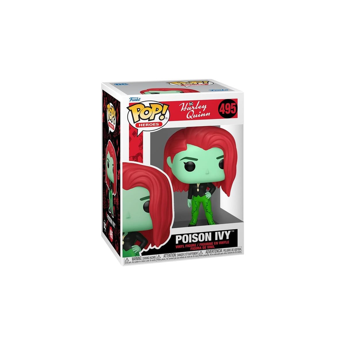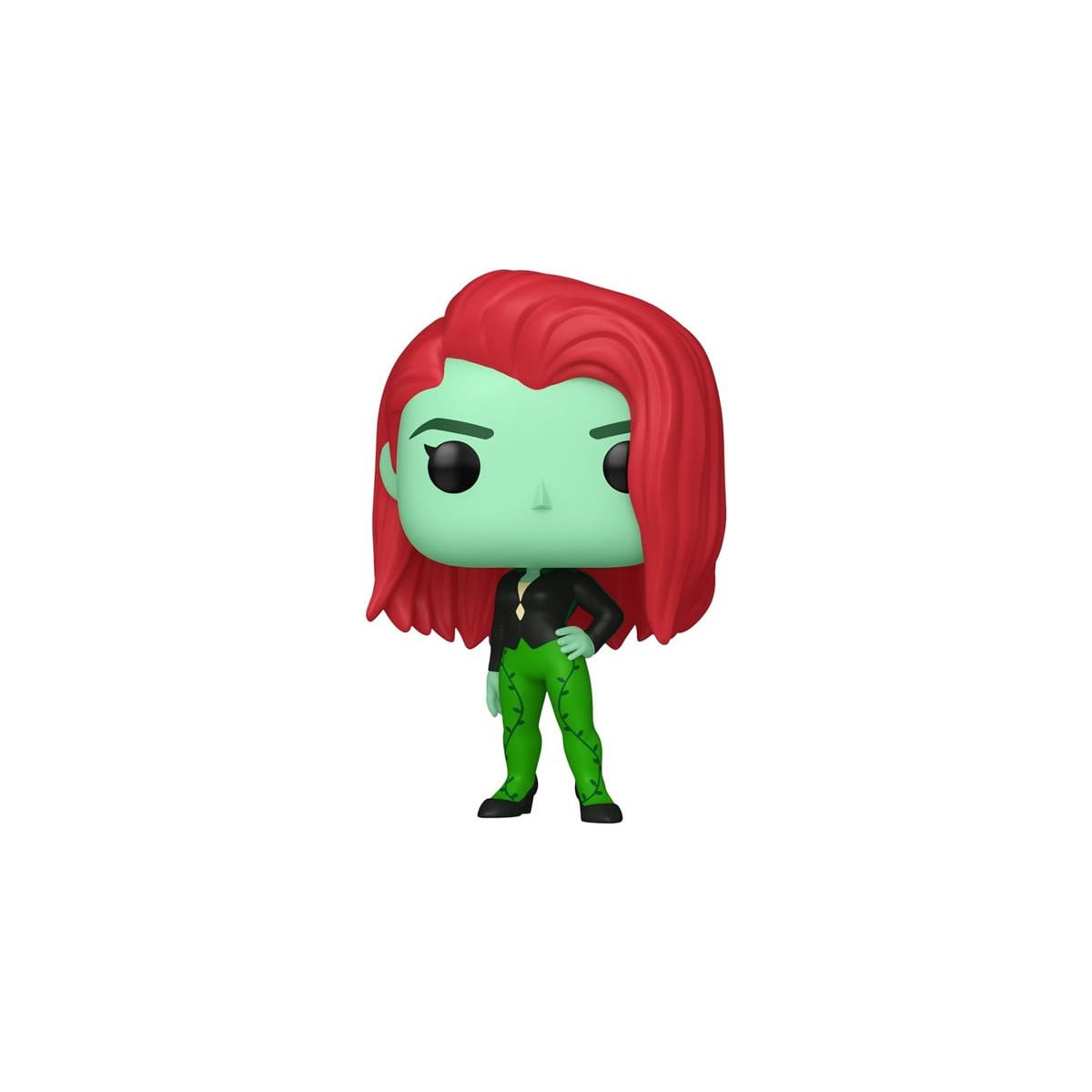 La figura Funko de Poison Ivy se caracteriza por su cabello rojo, su traje verde con detalles de hojas y enredaderas, y su expresión seria y decidida.