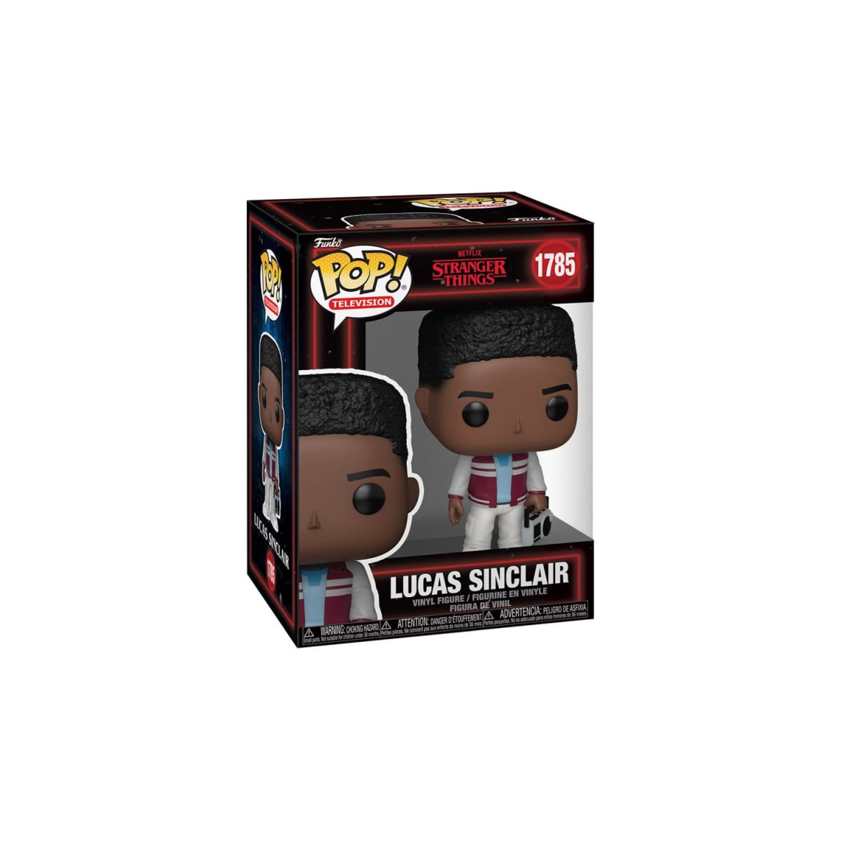 Figura Funko Pop! Lucas Sinclair de Stranger Things, modelo 1785. Fabricada en vinilo y presentada en caja con ventana, ideal para coleccionistas y seguidores de la serie.