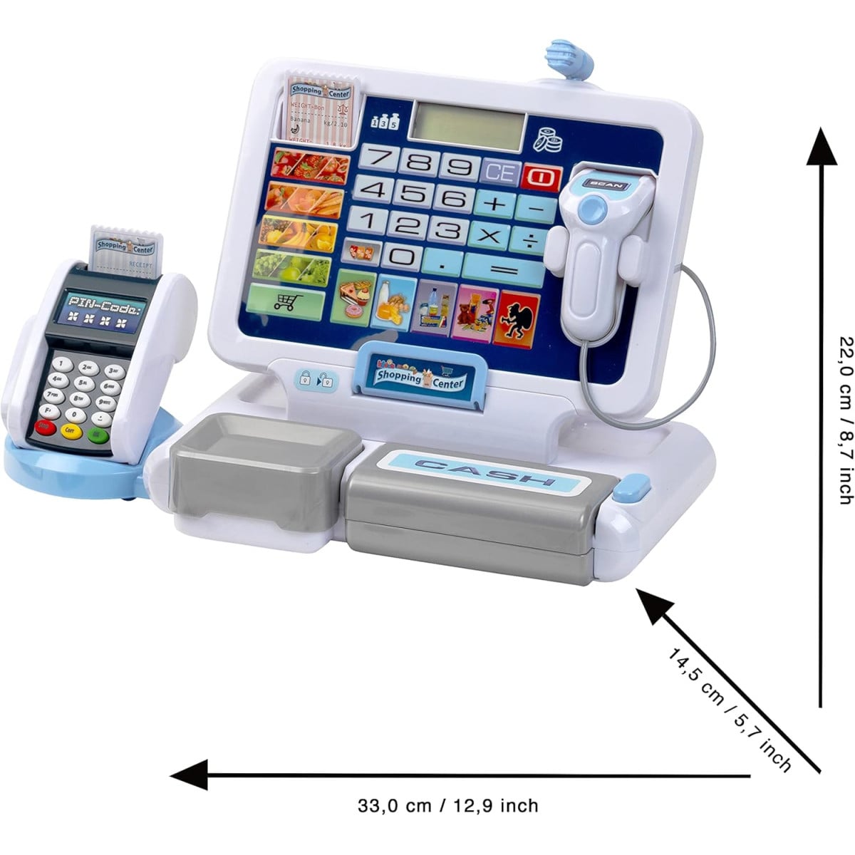 Con la garantía de calidad de Theo Klein, este set destaca por sus funciones electrónicas que incluyen sonidos, escáner y lector de tarjetas, ofreciendo una experiencia mucho más realista. Además, incorpora accesorios como terminal de pago, compartimentos para monedas y diferentes elementos que hacen el juego más dinámico y entretenido.