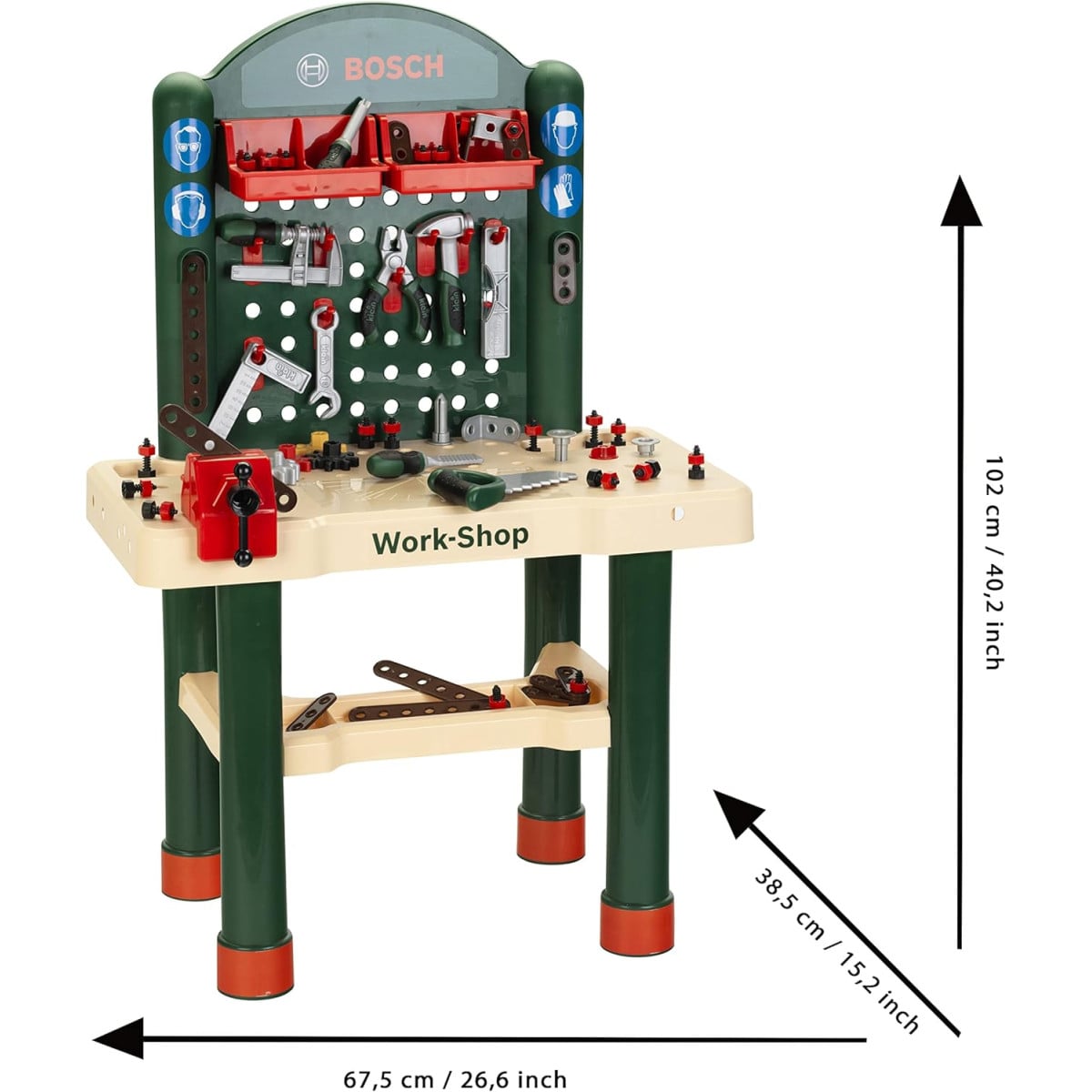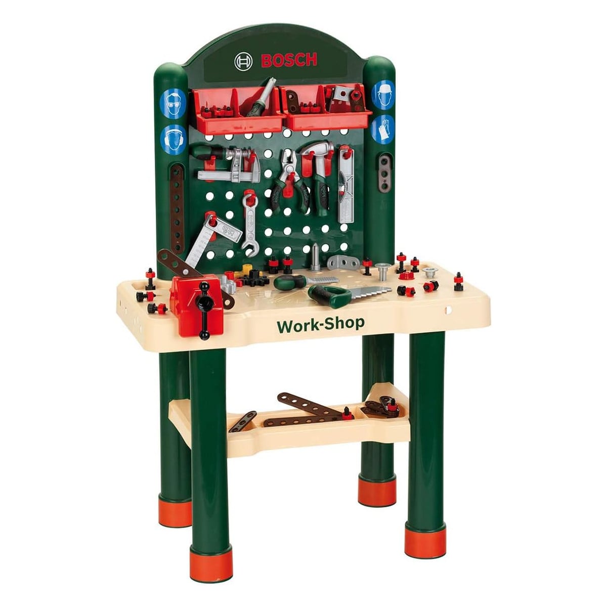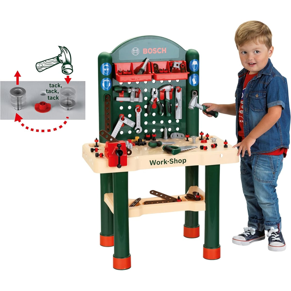 - Diseño: Taller de trabajo infantil con acabado imitación madera y estructura robusta, inspirado en herramientas Bosch reales.