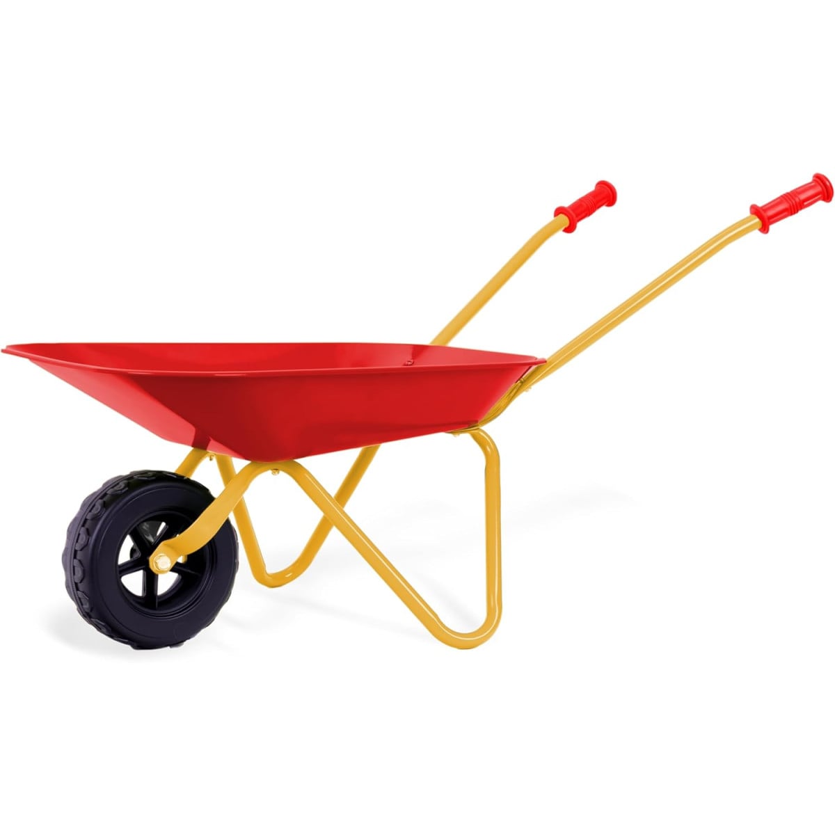 Descubre la Carretilla De Metal Roja, con rueda de goma y gran resistencia. Ideal para jugar en exterior transportando arena y juguetes.