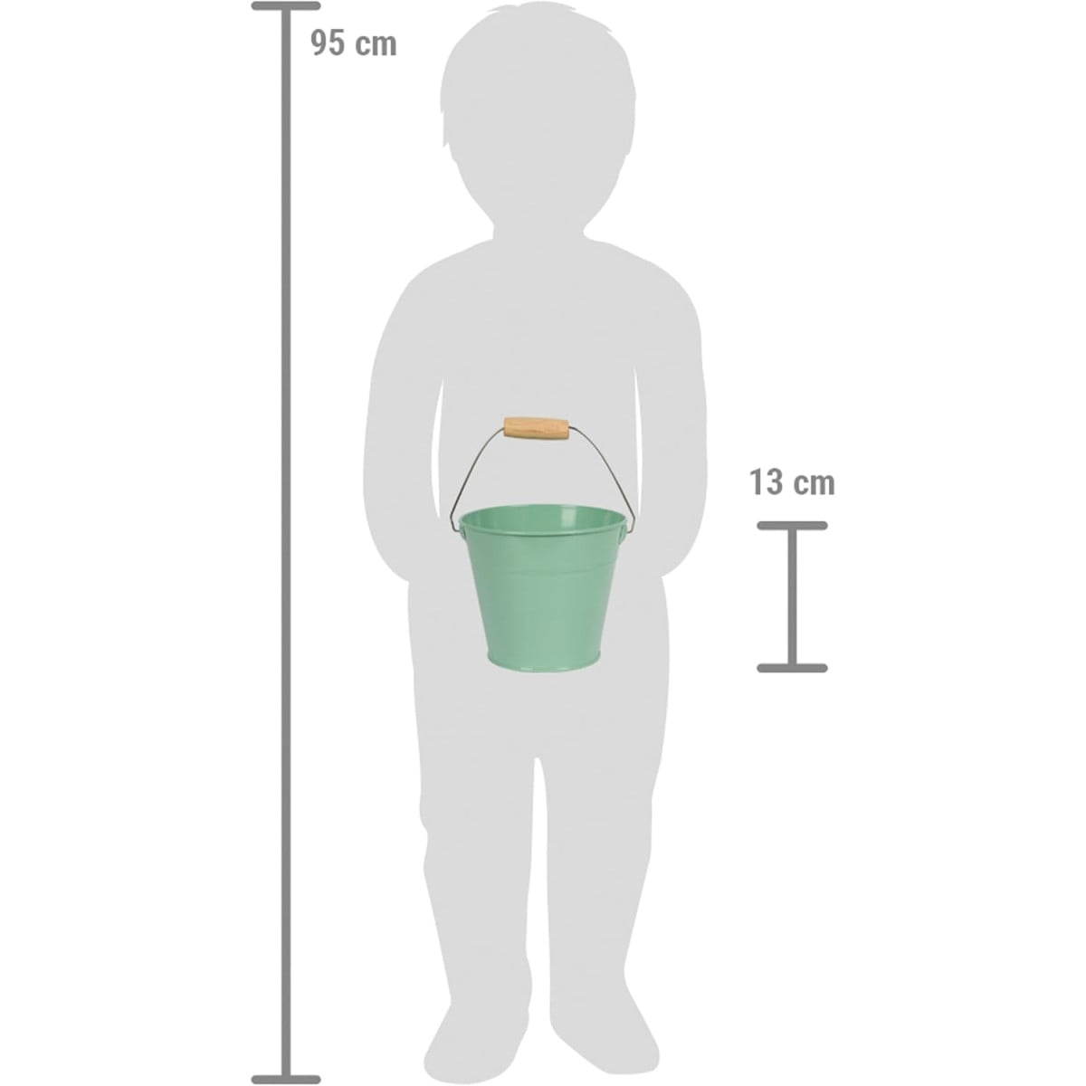 Incluye tres herramientas de jardín (pala, rastrillo y pala ancha) junto con un cubo metálico resistente, ideal para recoger y transportar materiales durante el juego. Gracias a su tamaño adaptado, es muy fácil de manejar para niños y niñas.