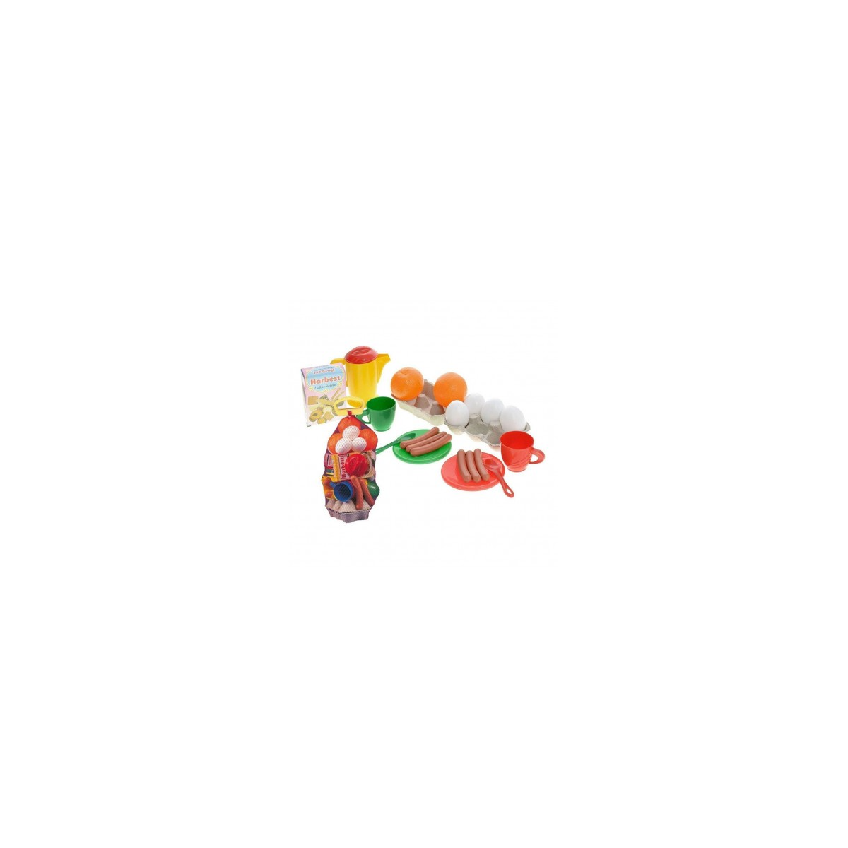 Gran Variedad de Alimentos: La bolsa de desayuno contiene una amplia selección de alimentos de juguete, como frutas, salchichas, huevos y otros elementos típicos de un desayuno completo.