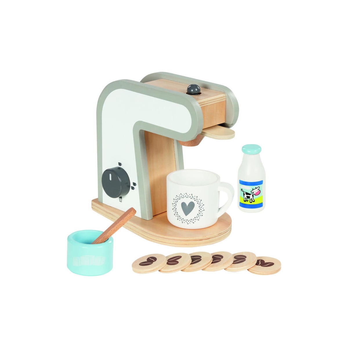 Tu peque sentirá que está preparando un café de verdad con esta cafetera de madera. Cuenta con un soporte y un depósito en la parte trasera para almacenar las cápsulas que deberás encajar para hacer tu café, ¡como una de verdad!
