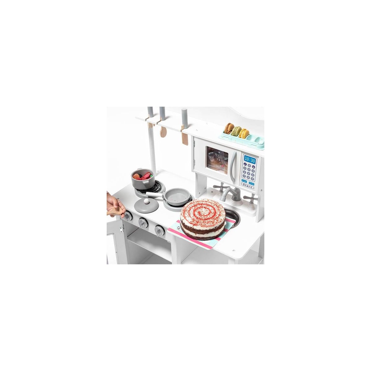 Este completo set incluye accesorios esenciales, como ollas, utensilios y alimentos de juguete, para que los niños y niñas puedan crear sus recetas más imaginativas. Los colores suaves y el diseño moderno hacen que esta cocina sea tan decorativa como funcional, encajando fácilmente en cualquier habitación infantil. Además, sus puertas que se abren, los botones giratorios y los detalles interactivos proporcionan una experiencia más realista que encanta a los pequeños.