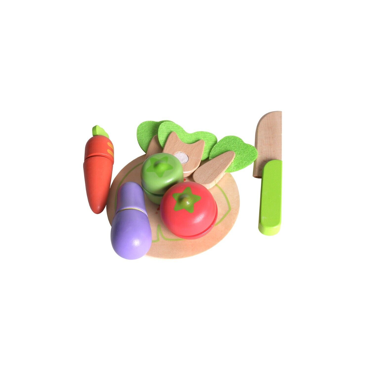 - Incluye: 1 kit de verduras de madera con velcro por la mitad con 1 manzana, 1 pera, 1 berenjena., 1 hojas de lechuga, 1 zanahoria, 1 cuchillo y 1tabla de cortar