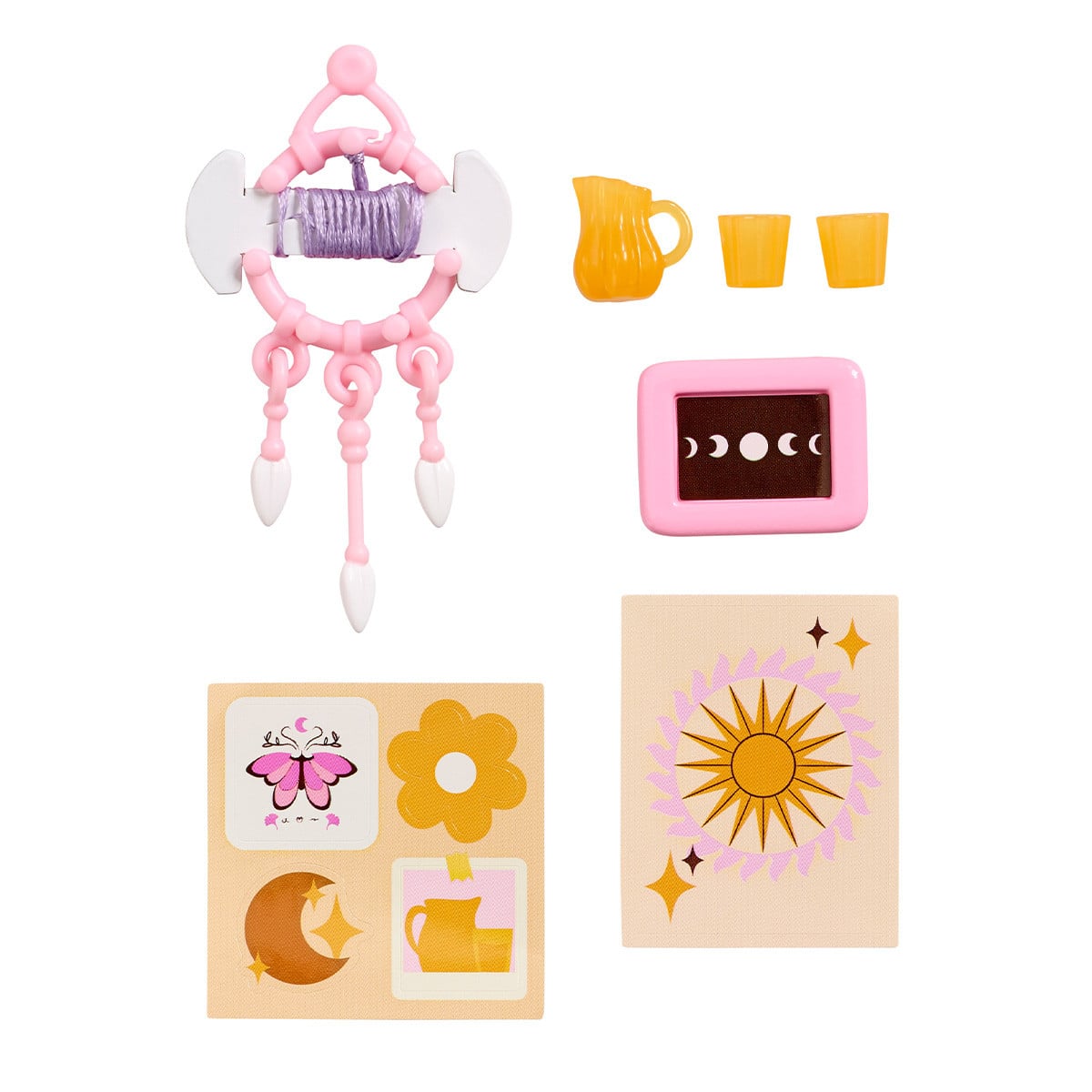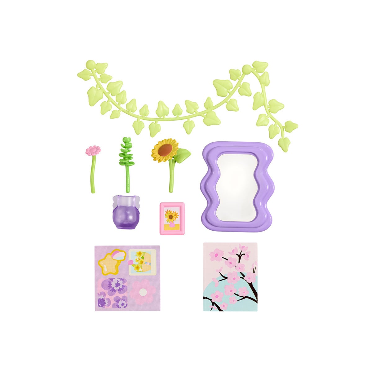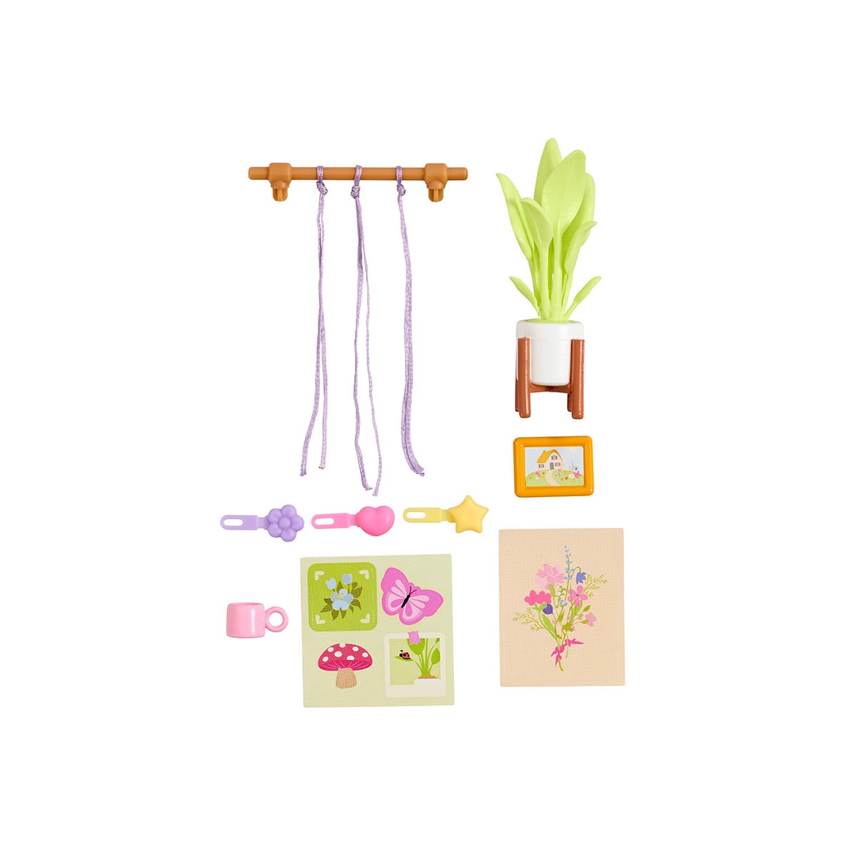 Cada set incluye pequeños elementos decorativos como cojines, láminas, plantas, guirnaldas, mini muebles y accesorios DIY que permiten crear combinaciones súper creativas. Es perfecto para niños y niñas que disfrutan montando, decorando y cambiando su espacio a su gusto, fomentando la imaginación y el juego simbólico.