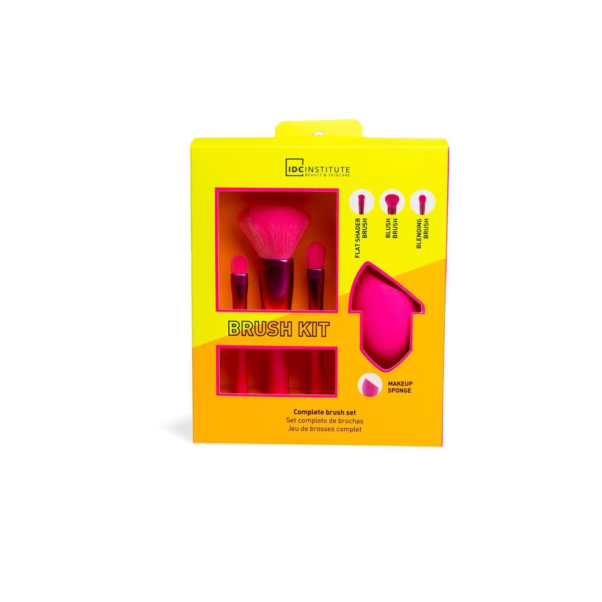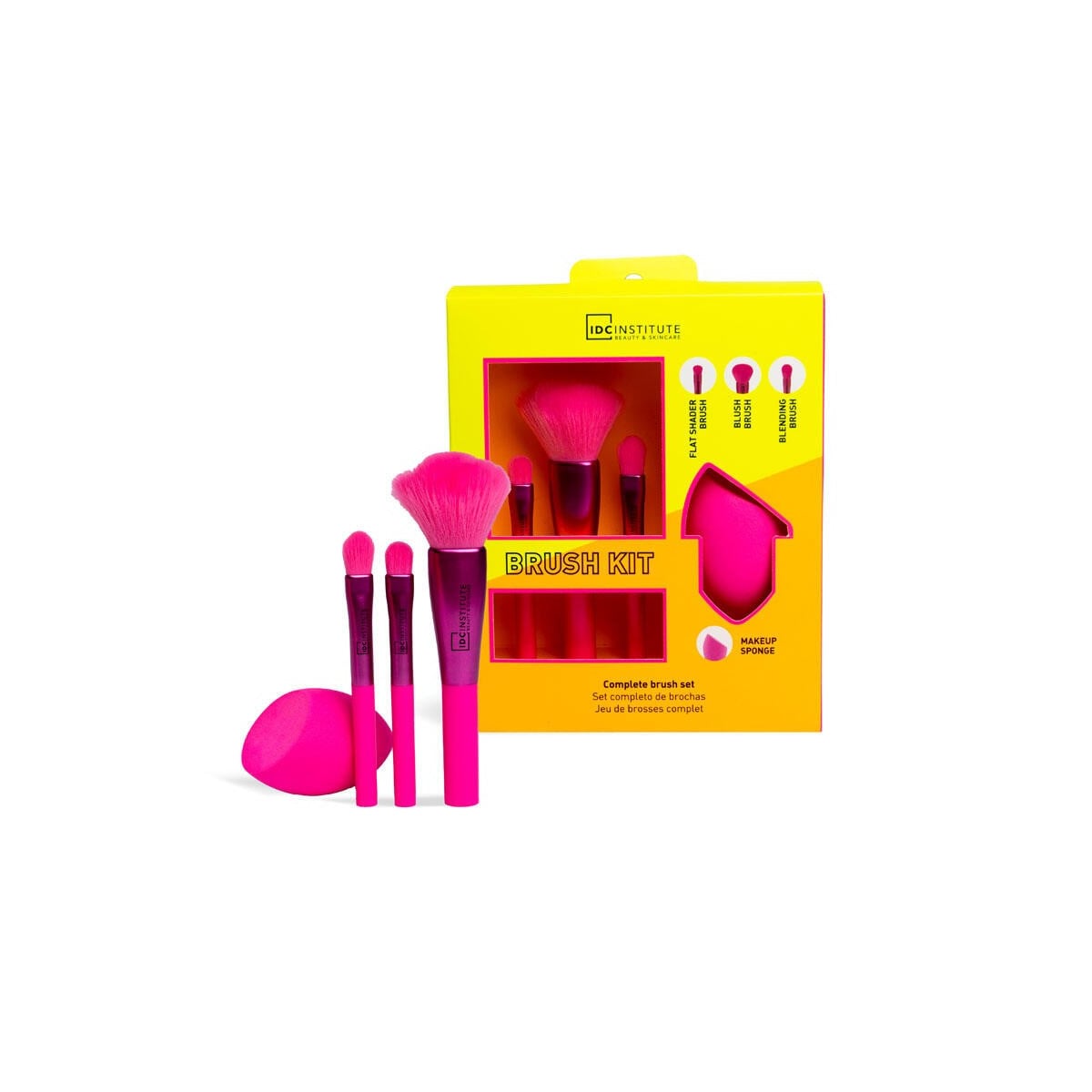 Set IDC Institute con brocha de polvos, dos brochas de ojos y esponja para maquillaje, ideal para aplicar y difuminar con un acabado uniforme.