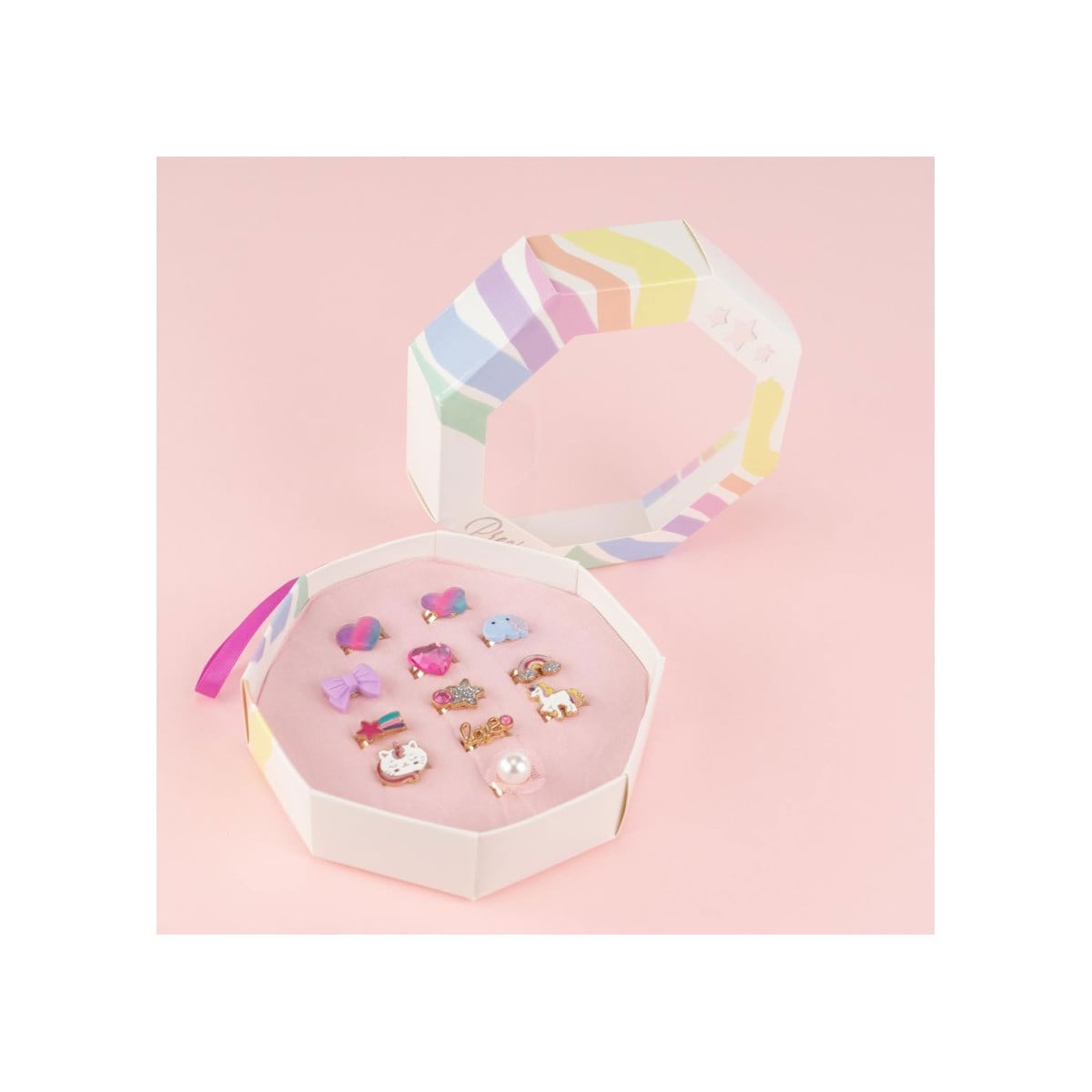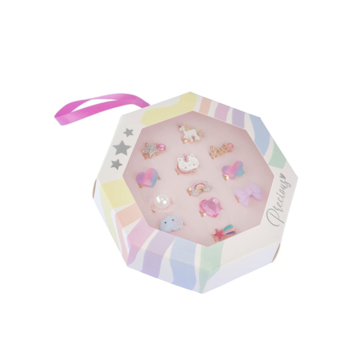 - Incluye: 12 anillos con diversas formas: 2 corazones multicolor, 1 gema corazón, 1 unicornio, 1 estrella fugaz, 1 estrella, 1 arcoíris, 1 nube, 1 gato y 1 "love".