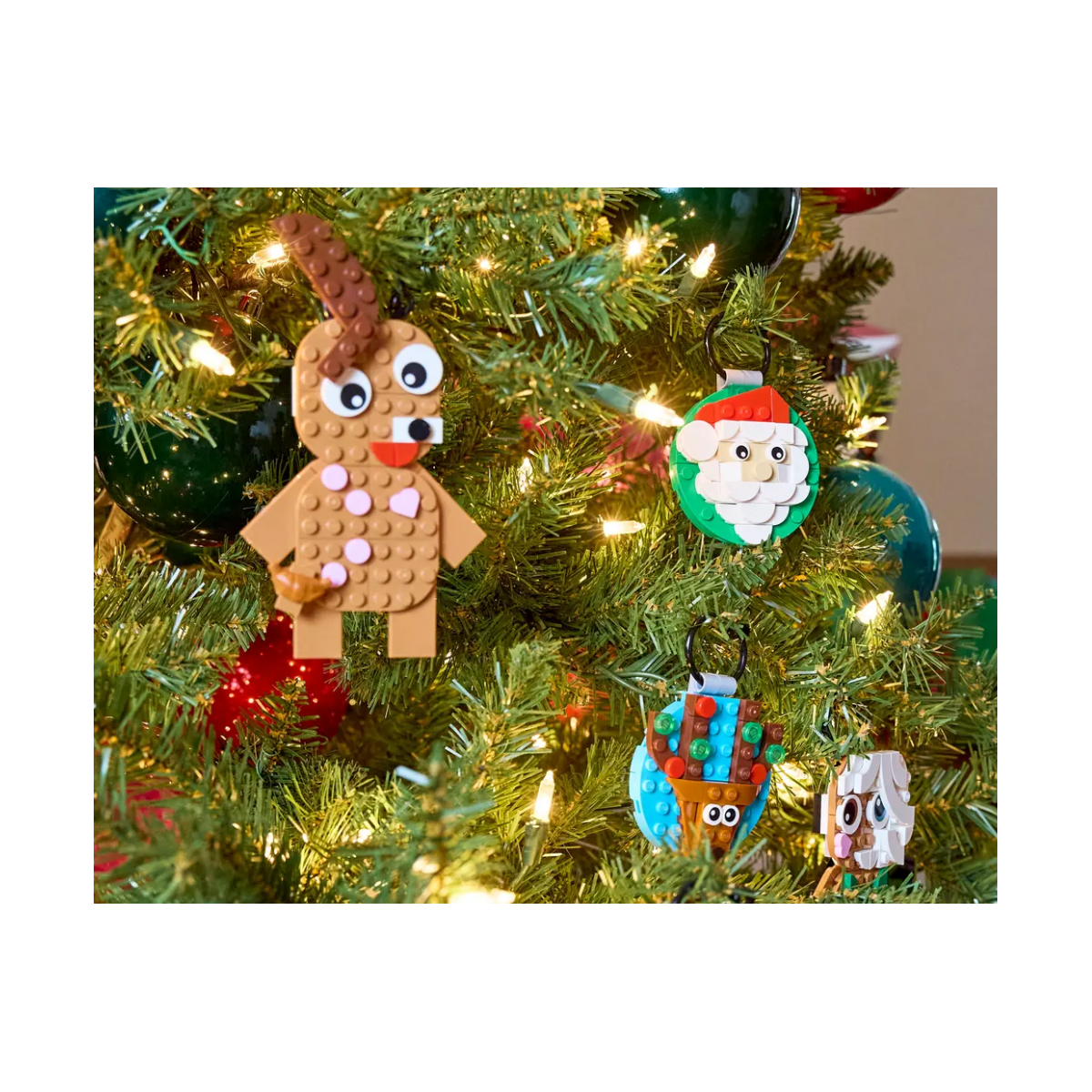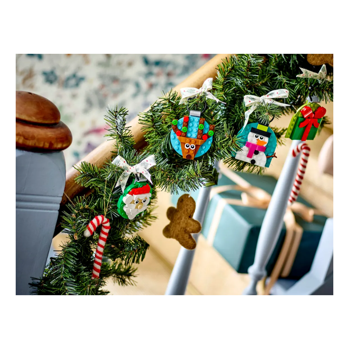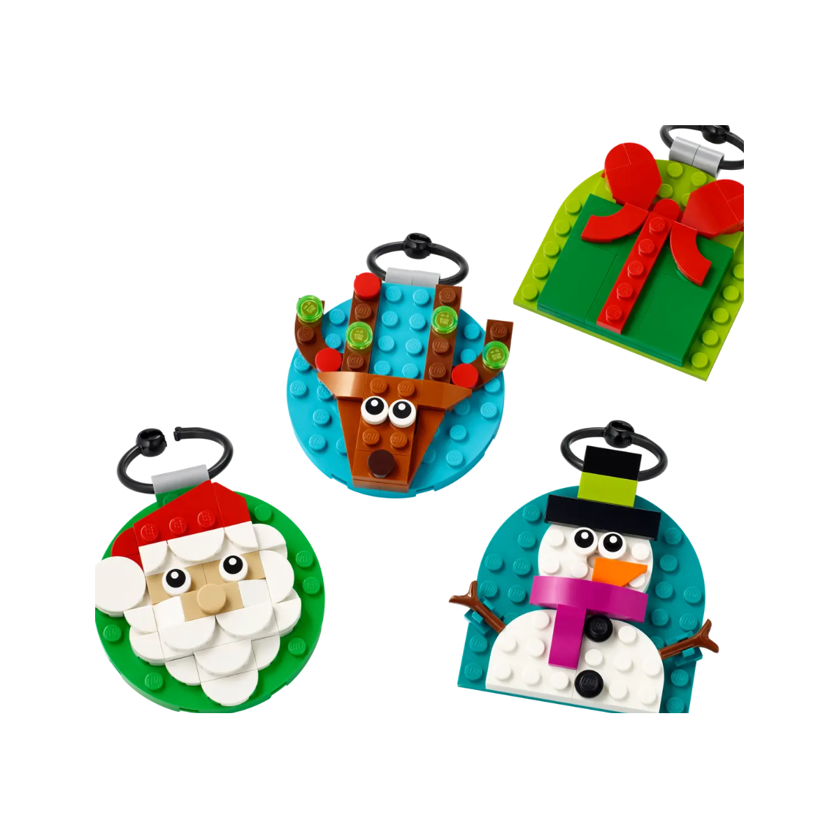 Descubre el LEGO Adornos Navideños, con 4 adornos colgantes navideños: regalo, Papá Noel, muñeco de nieve y reno, listos para colgar o exponer.