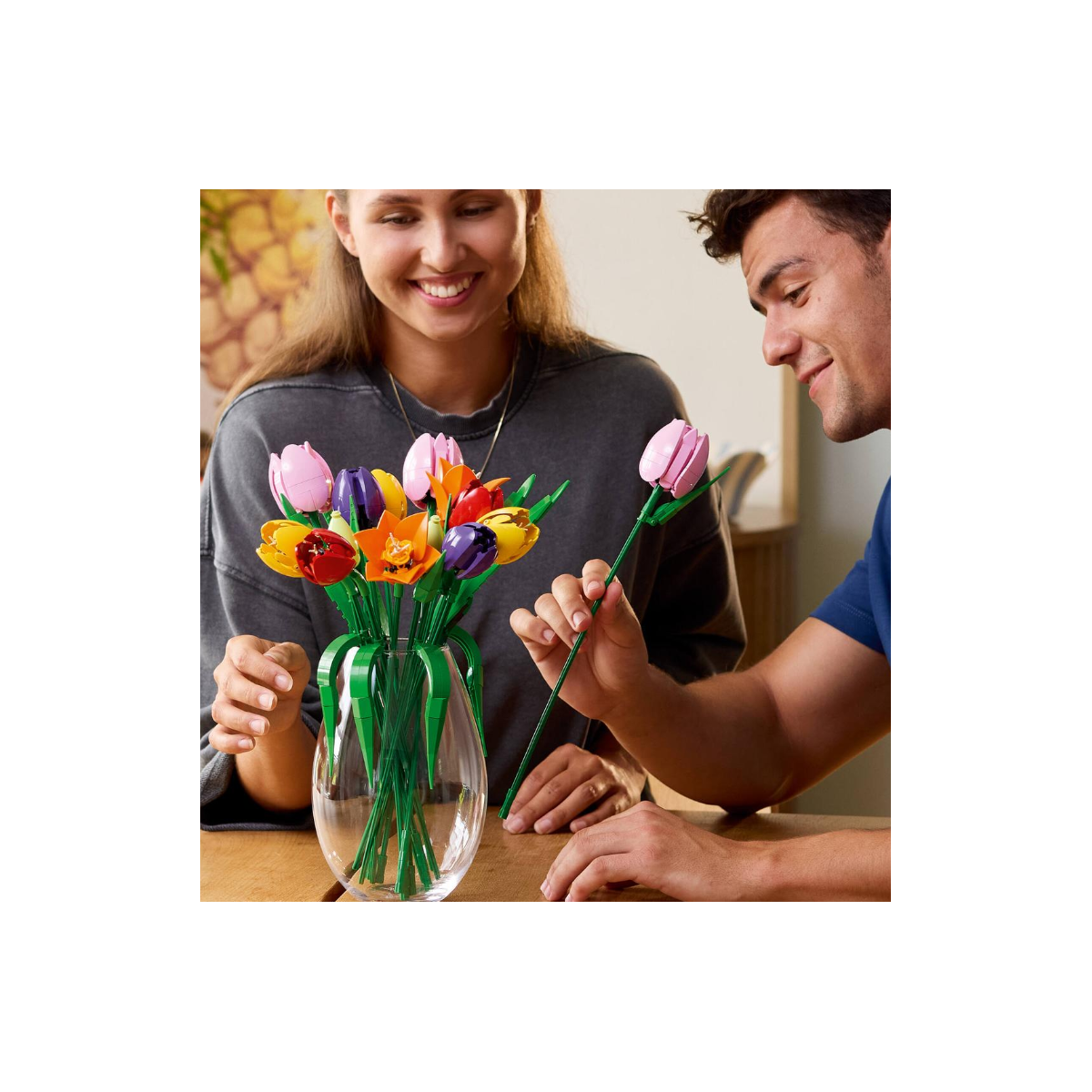 A diferencia de otros sets, aquí el protagonismo lo tiene el proceso. Construir cada tulipán permite disfrutar del ritmo pausado del montaje y del placer de ver cómo el ramo va creciendo poco a poco. El resultado es una composición equilibrada que transmite armonía y encaja fácilmente en distintos espacios del hogar, desde un salón hasta un escritorio.