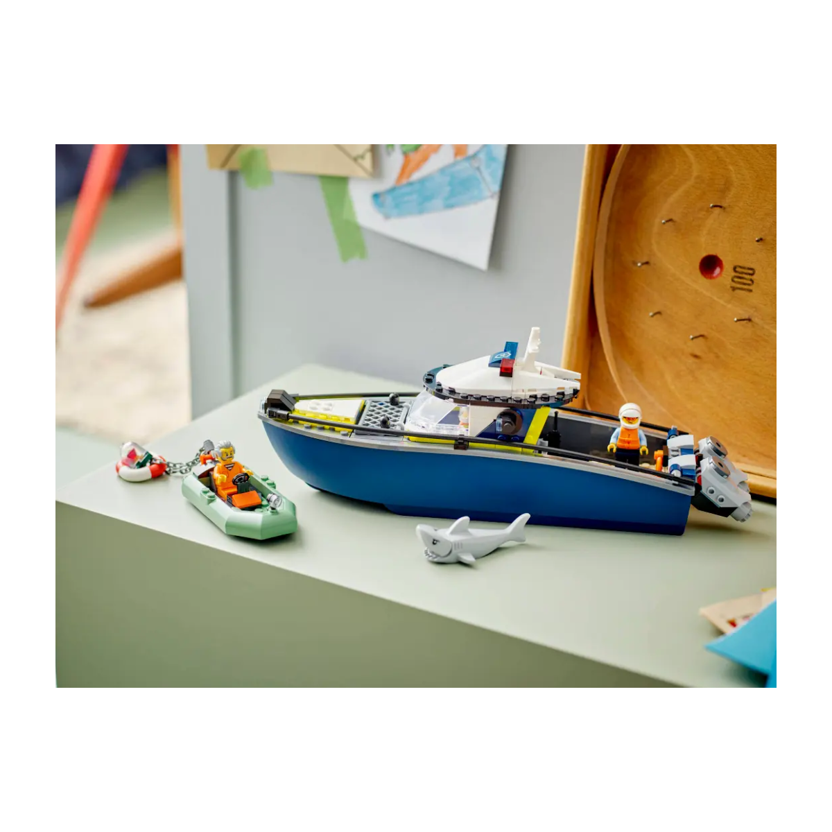 El set incluye una lancha policial motorizada (no flotante) equipada con cabina y foco de búsqueda, y una lancha de los ladrones con potentes motores y escondite para el botín. Además, trae 3 minifiguras: dos agentes de policía y un ladrón, además de una figura de tiburón. La historia arranca cuando los agentes descubren el escondite del dinero y comienza una persecución por aguas turbulentas.