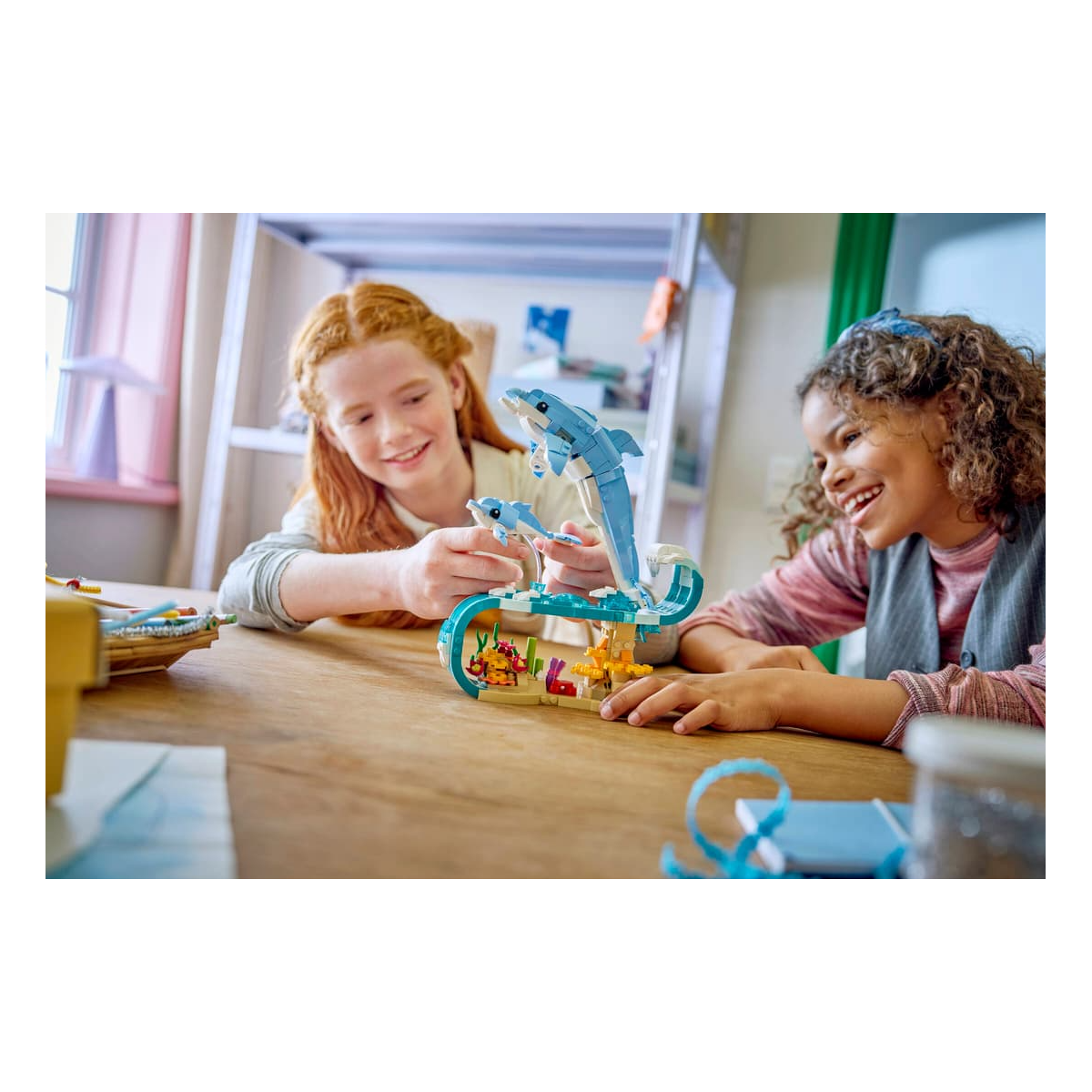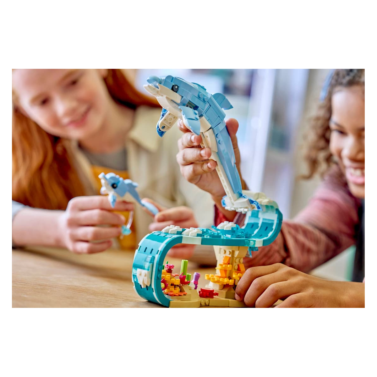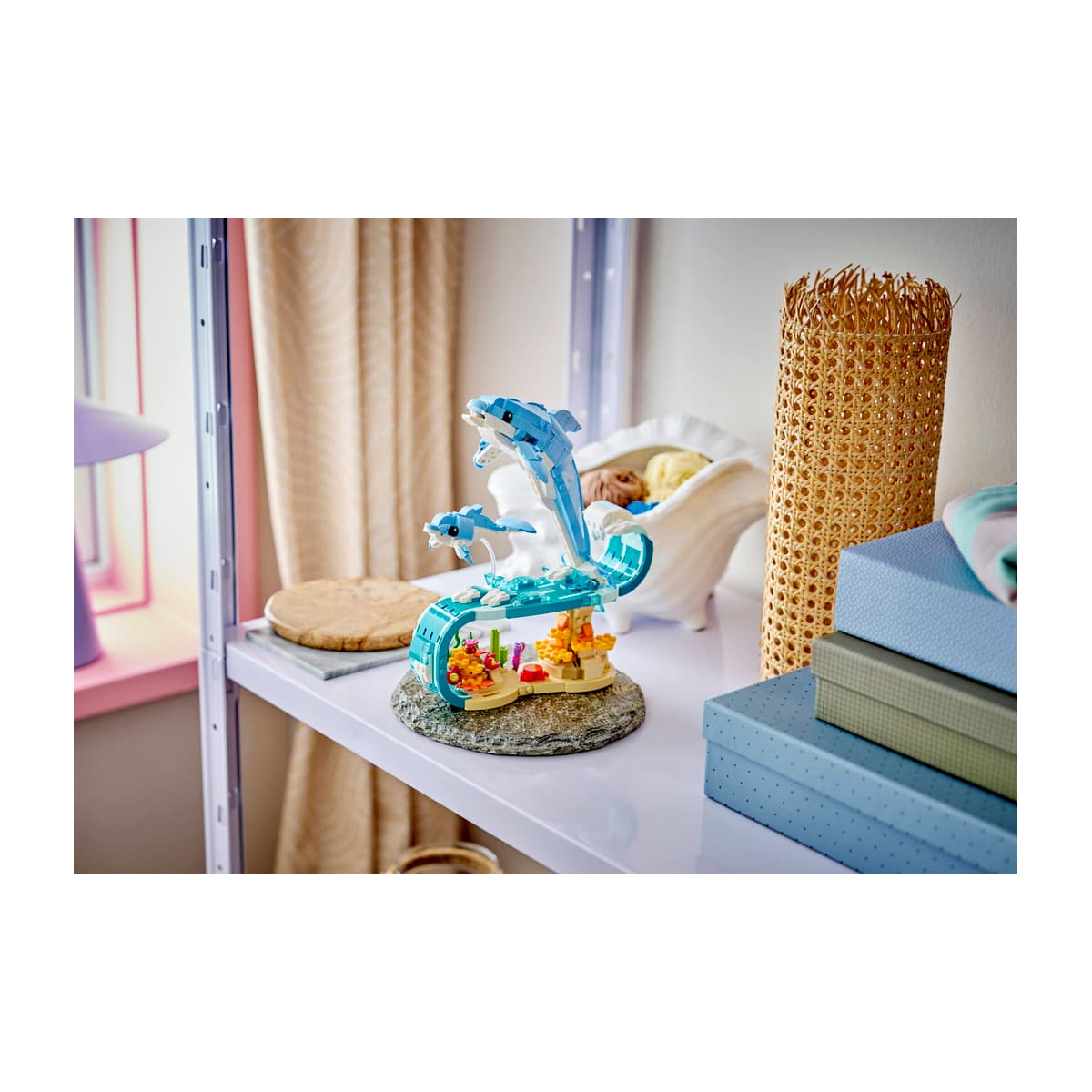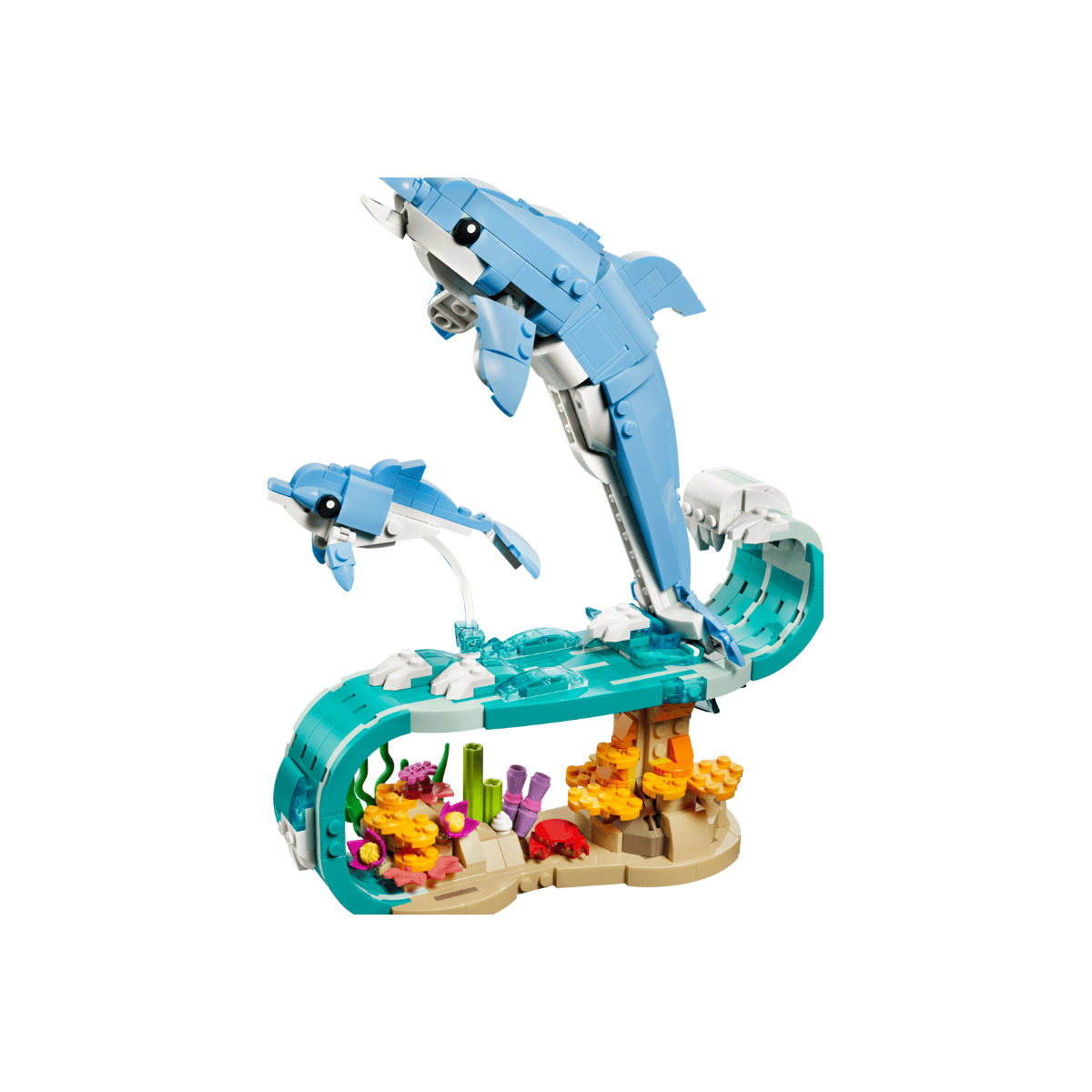 La experiencia de construcción se centra en dar forma a las siluetas estilizadas de los delfines y al entorno marino que los acompaña. Cada pieza contribuye a transmitir ligereza y fluidez, creando una composición equilibrada que recuerda a los saltos sobre el agua. Es un modelo que invita a construir con calma y apreciar el resultado final desde diferentes ángulos.
