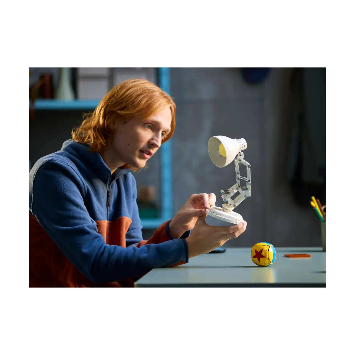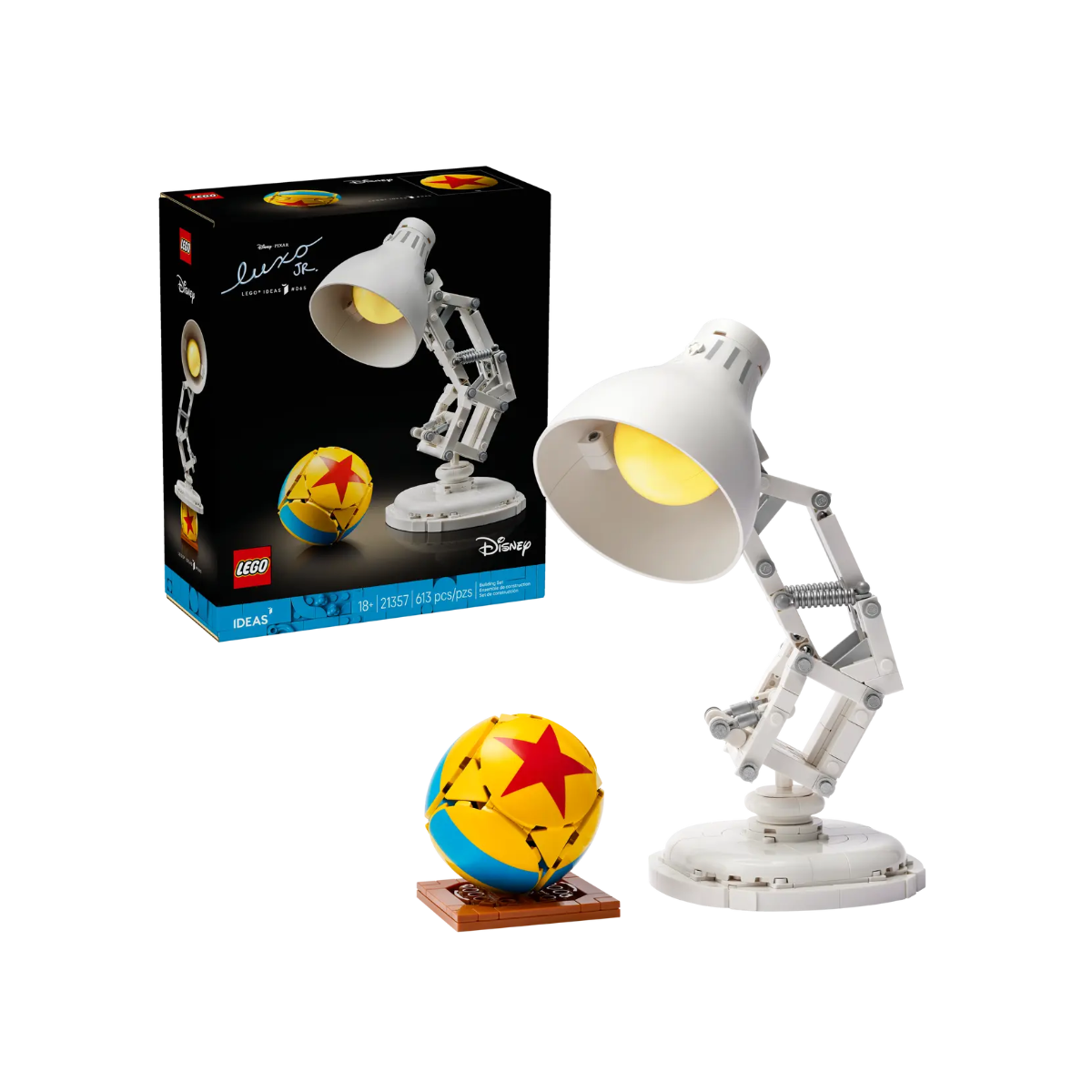 El set reproduce a Luxo Jr. con un diseño fiel al personaje, incluyendo una base con el logotipo de Pixar y una pelota amarilla con estrella roja, otro símbolo clásico del estudio. La lámpara es articulada y puede colocarse en varias posturas, lo que la convierte en una pieza dinámica para escritorio, estantería o como regalo creativo para fans del cine de animación.
