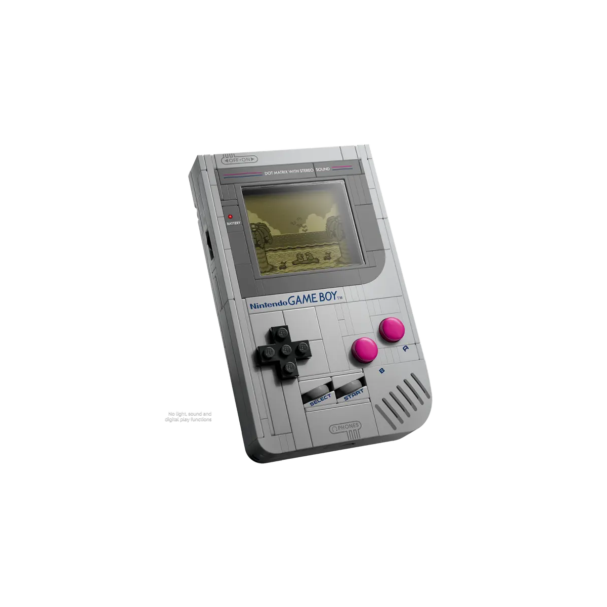 Este set LEGO Game Boy ofrece una fiel réplica construible de la consola portátil original del Nintendo Game Boy, diseñada ladrillo a ladrillo con detalles auténticos: la cruceta, los botones A y B, SELECT y START, rueda de volumen, control de contraste y ranura para cartucho “Game Pak”. Incluye base para exponer tu creación, transformándola en un objeto decorativo además de construcción.