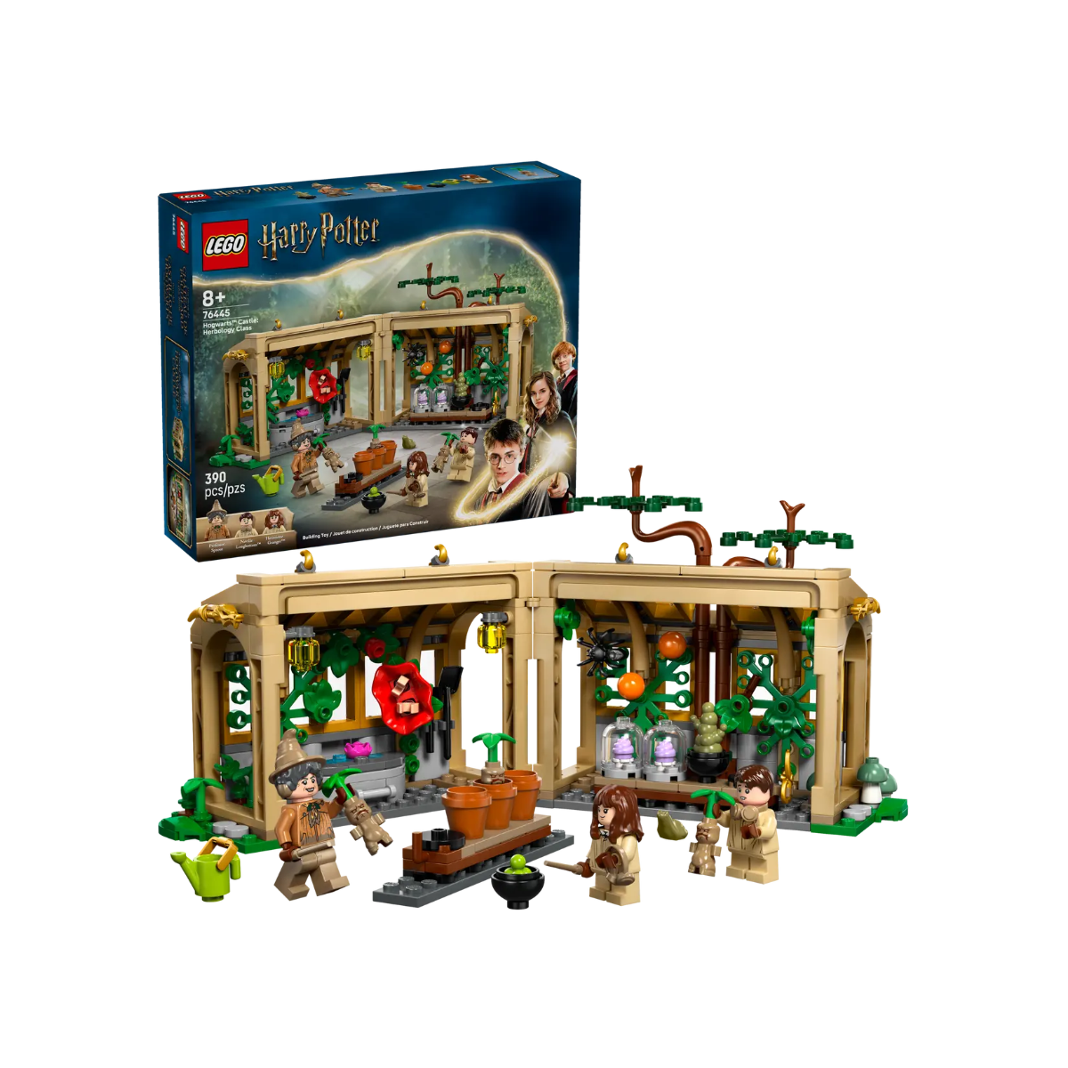 Incluye 3 minifiguras: Neville Longbottom, la Profesora Sprout y Cedric Diggory, todos con túnicas de Hogwarts y accesorios para la clase, como regaderas, libros de pociones y, por supuesto, Mandrágoras que pueden “plantarse” en sus macetas. El invernadero se abre para jugar y se pliega para guardarlo como un libro decorativo, lo que lo convierte en una opción ideal para jugar en casa o llevar a cualquier parte.