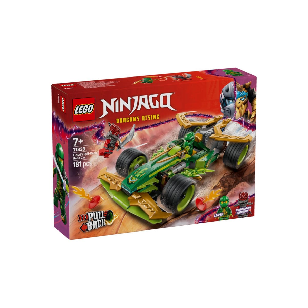 Lo que hace especial a este coche es su motor de carga manual, que permite lanzarlo a gran velocidad sin necesidad de pilas. Solo hay que empujarlo hacia atrás y soltarlo para ver cómo arranca a toda velocidad, lo que garantiza una jugabilidad dinámica y llena de adrenalina. Además, el set incluye una minifigura de Lloyd, equipado con su característico traje ninja y una katana, listo para enfrentarse a cualquier enemigo que se interponga en su camino.