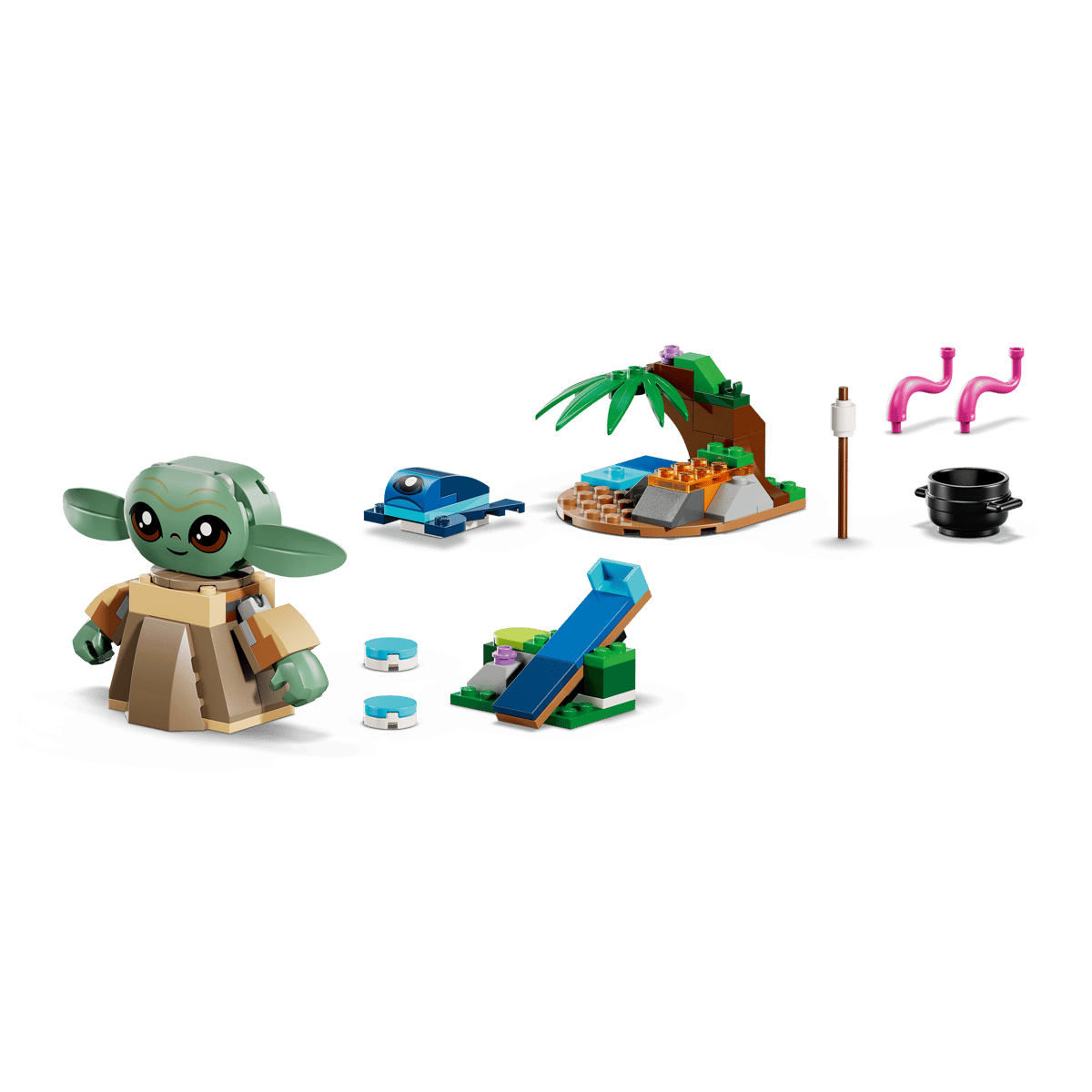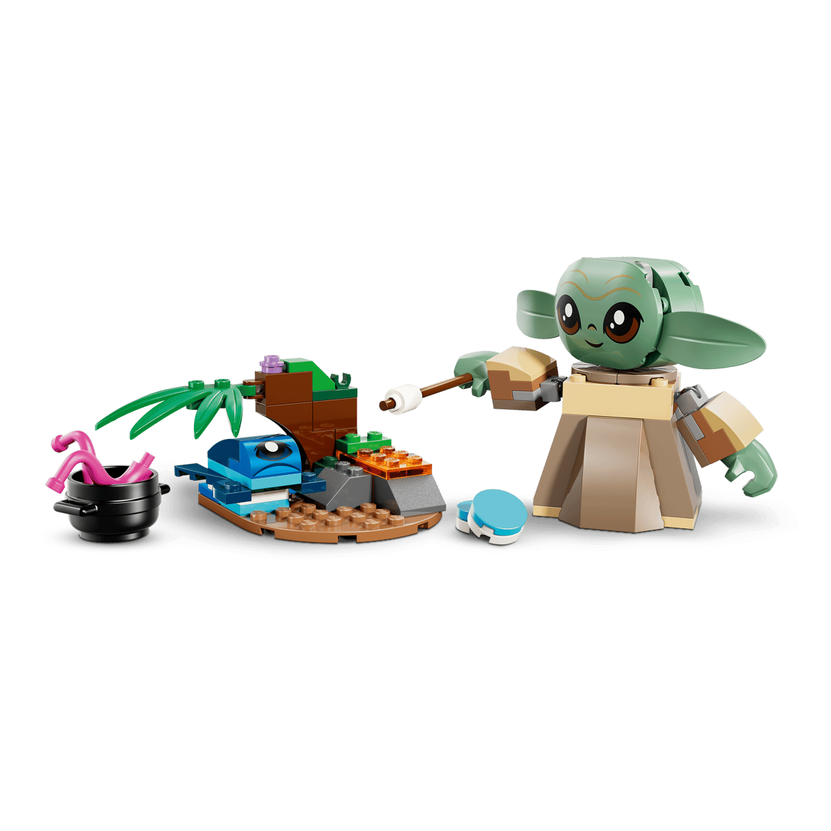 Incluye una figura articulada de Grogu fácil de construir, además de una rana de Sorgan, 2 mini construcciones y accesorios que enriquecen el juego. Podrán lanzar la rana por los aires con la divertida catapulta o recrear escenas junto a la chimenea con la olla, los tentáculos, la nube de azúcar en un palo y los característicos macarrones azules. Uno de ellos puede colocarse en la barriguita de Grogu, un detalle que encantará a los peques.