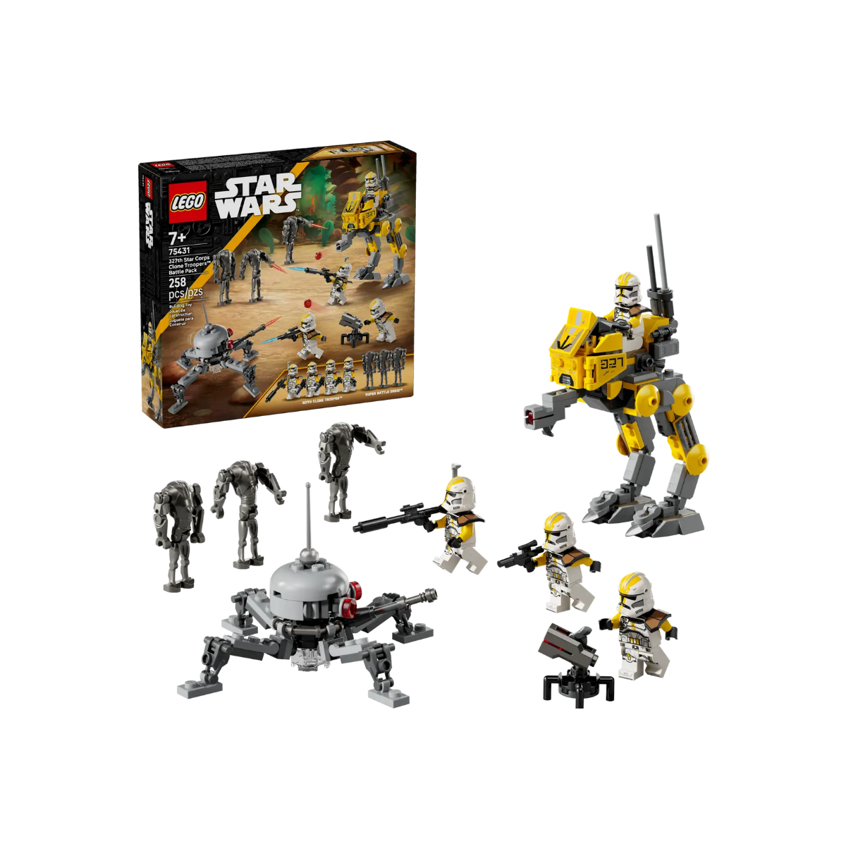 Con 258 piezas, este set de LEGO incluye 7 figuras: 4 soldados clon del 327 con armaduras impresas, 3 superdroides de combate, un caminante AT‑RT con piloto y un droide araña Spider Droid totalmente articulado. Las figuras cuentan con accesorios como armas, prismáticos y turrets para el juego táctico y creativo.