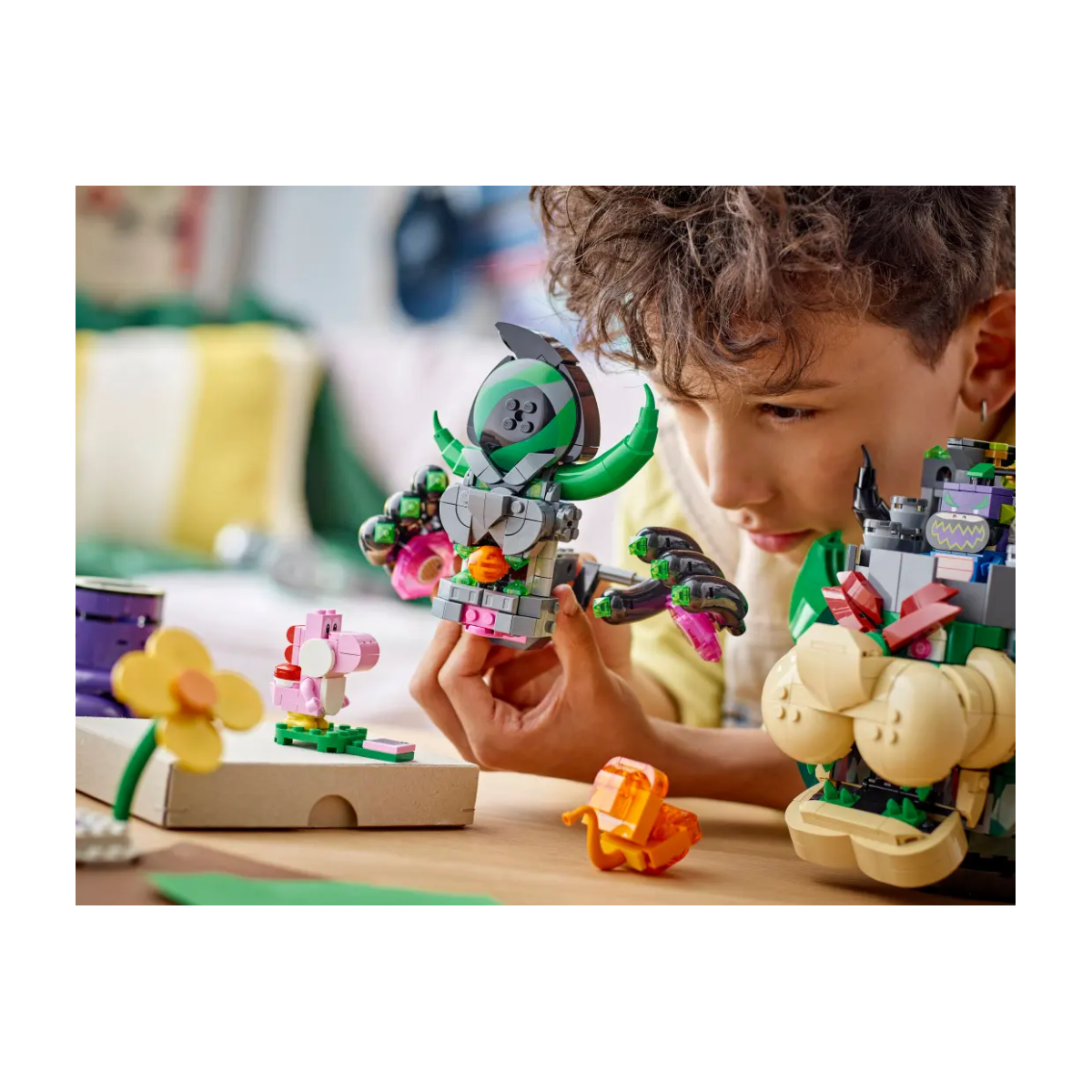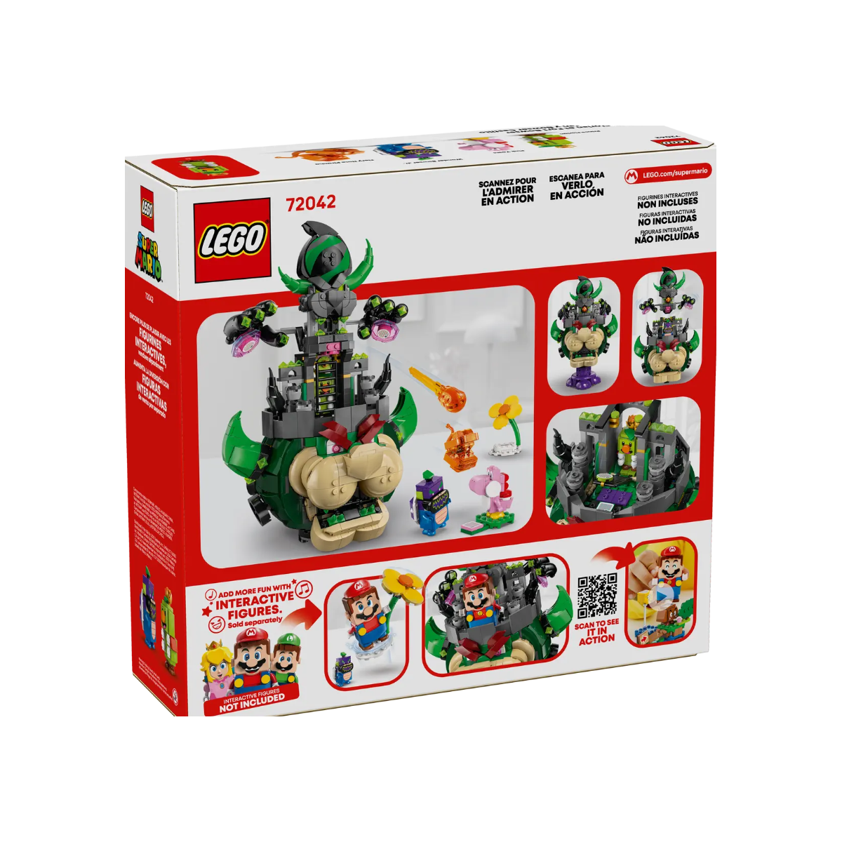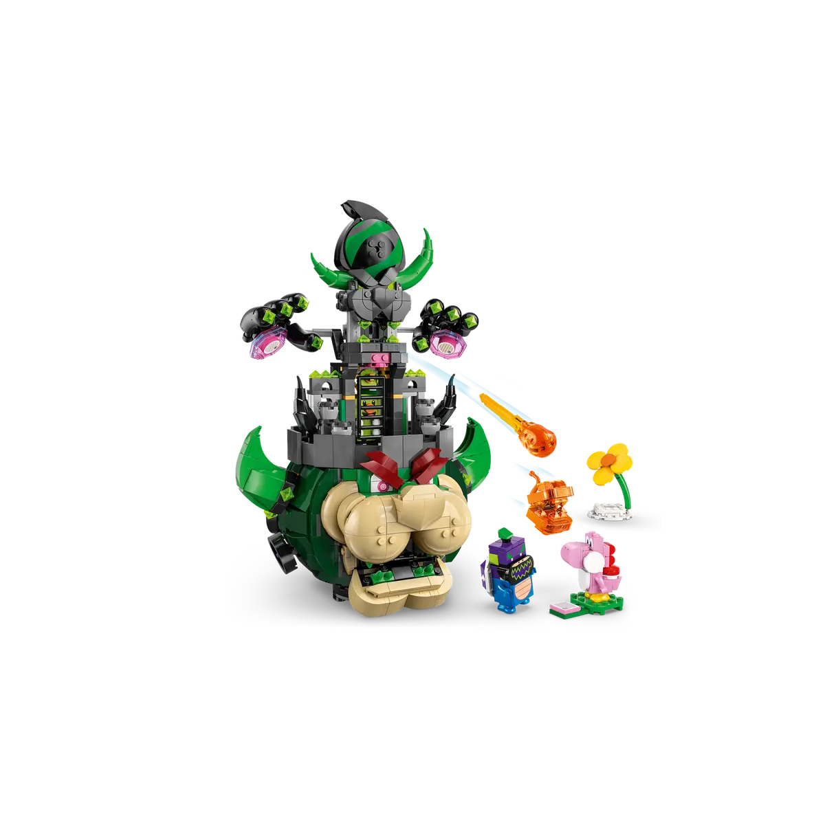 - Figuras incluidas: Una gran figura de juguete de Bowser Castillo para construir, así como un Yoshi Rosa, una Pirocorchea Piraña, al Príncipe Florian y a Bowsy Maravilla.