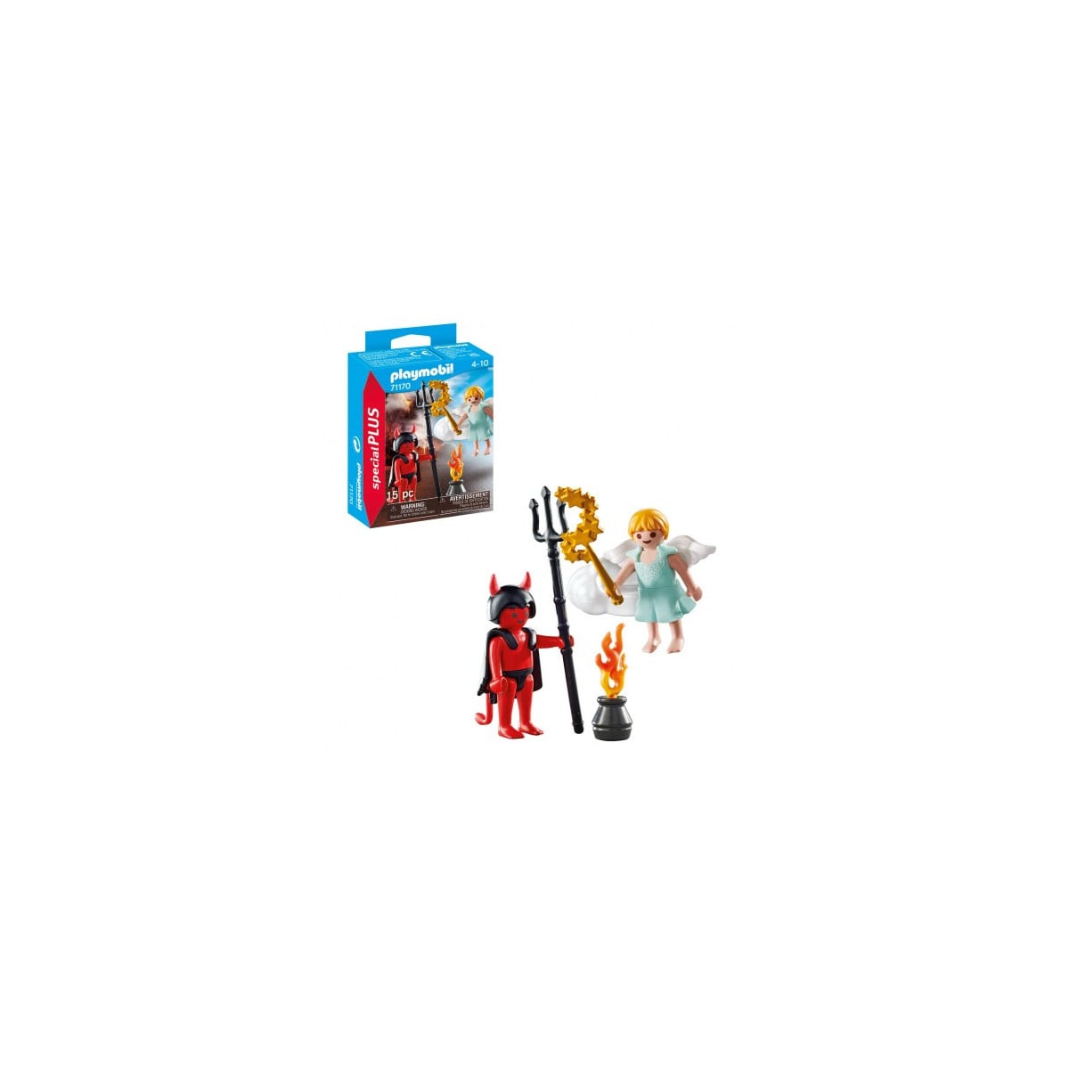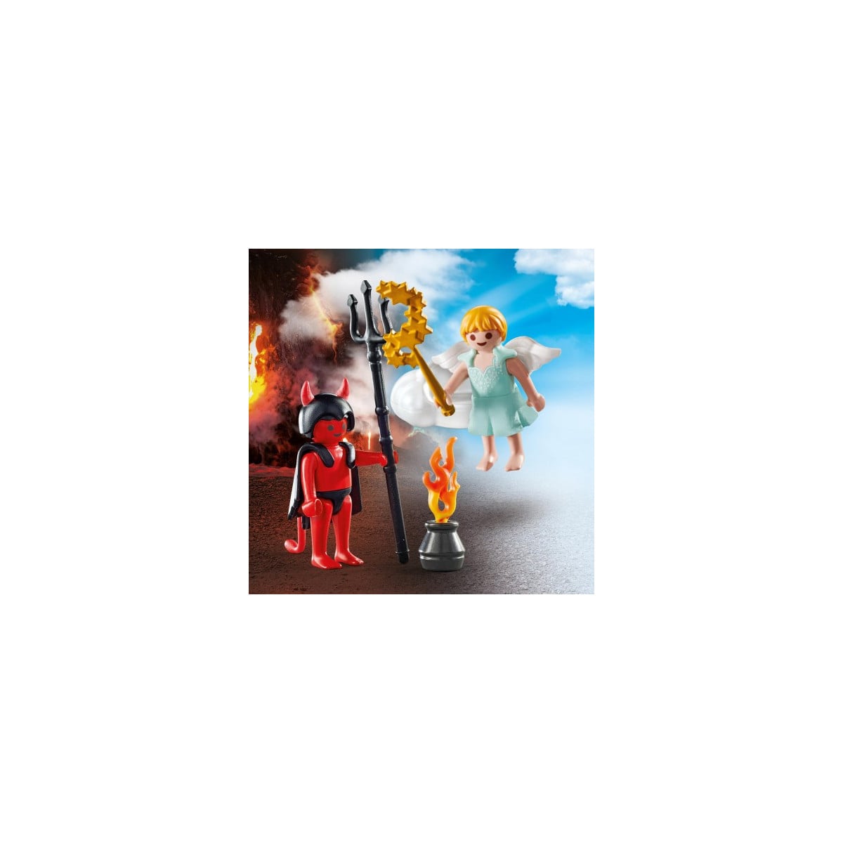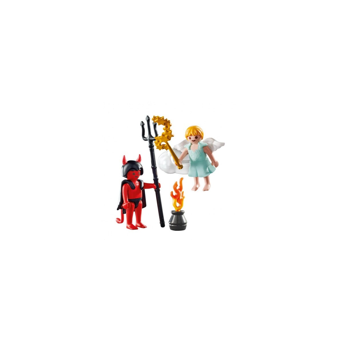 - Incluye: 1 figura Playmobil demonio y 1 figura ángel, 1 tridente, 1 barita mágica y 1 hoguera.
