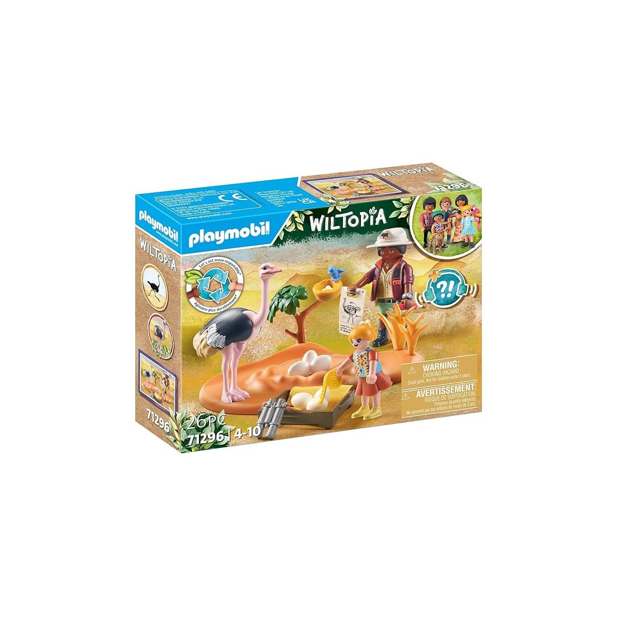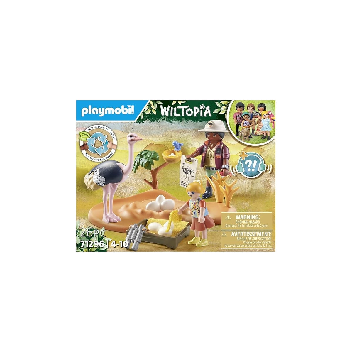 - Incluye: 1 figura Playmobil adulta, 1 figura Playmobil niño, 1 figura avestruz, 1 base con nido de avestruz, 6 huevos de avestruz, 1 nido de pájaro, 1 pájaro, algunos accesorios científicos más y una tarjeta de conocimiento del Avestruz.