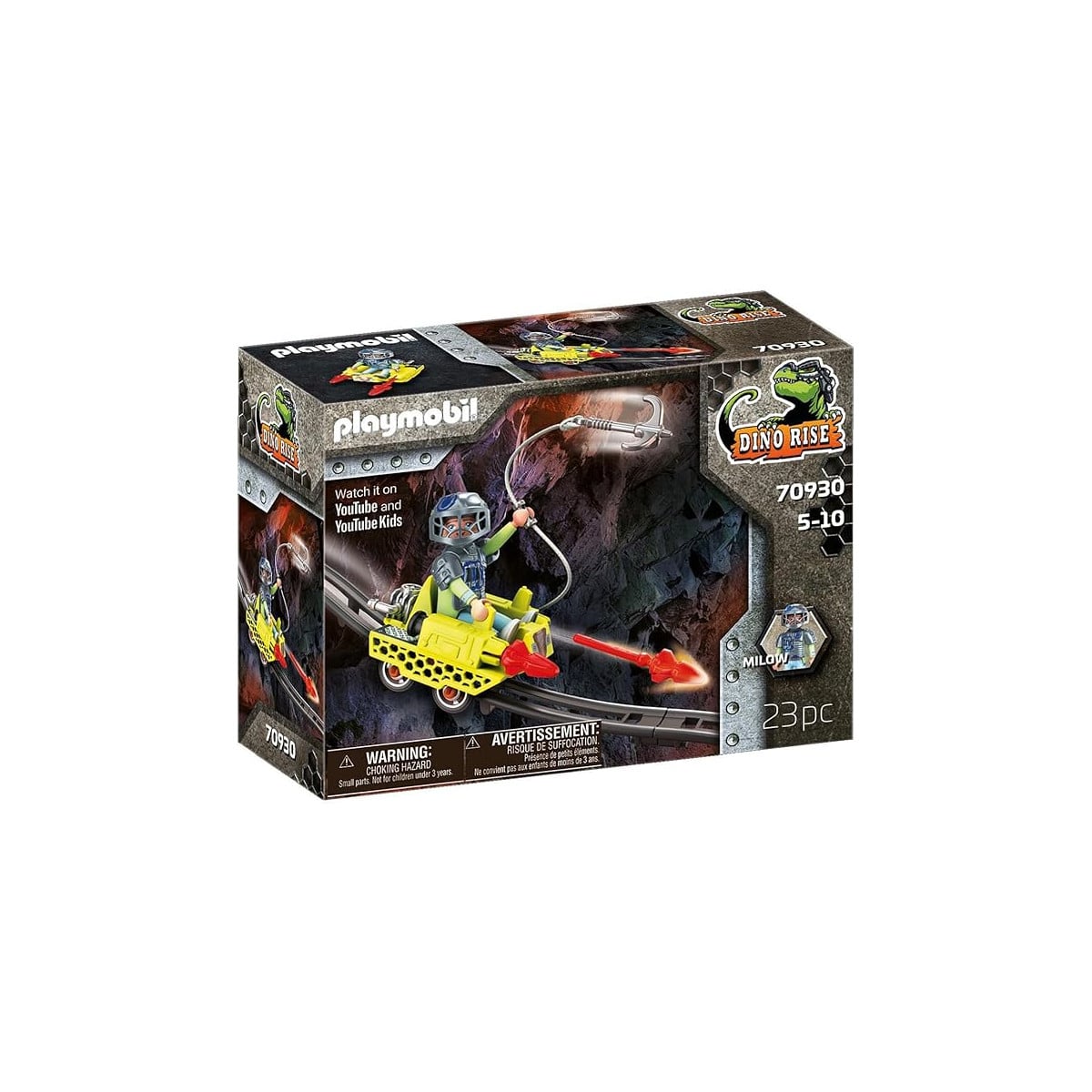 ¡Ayuda a Milow a liberar al dinosaurio encarcelado en la Dino Mine! Con espacio para una figura y dos cañones que funcionales.