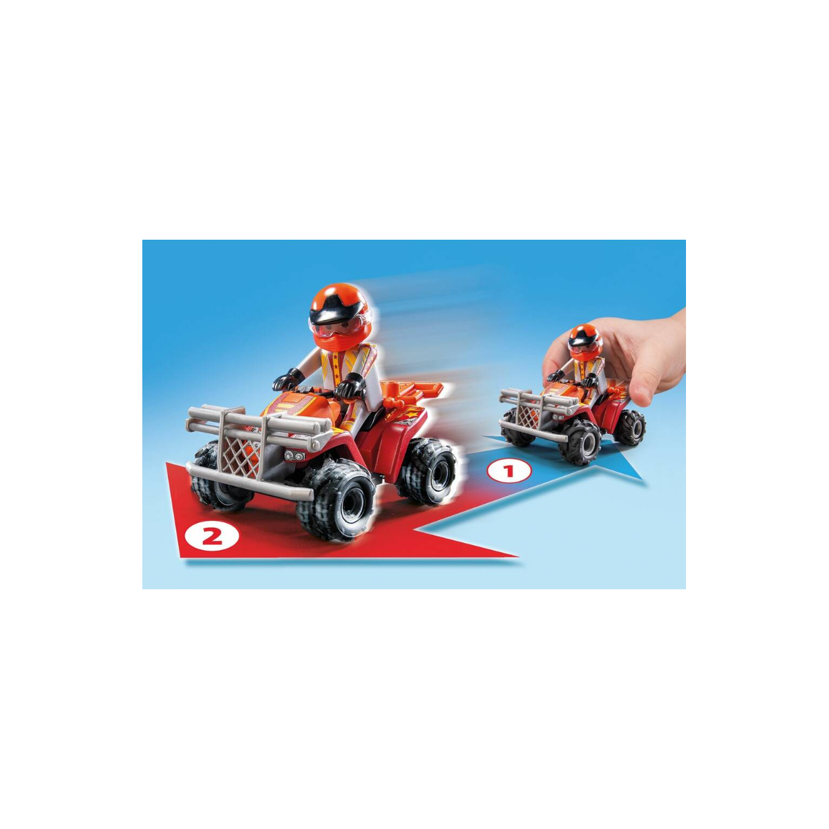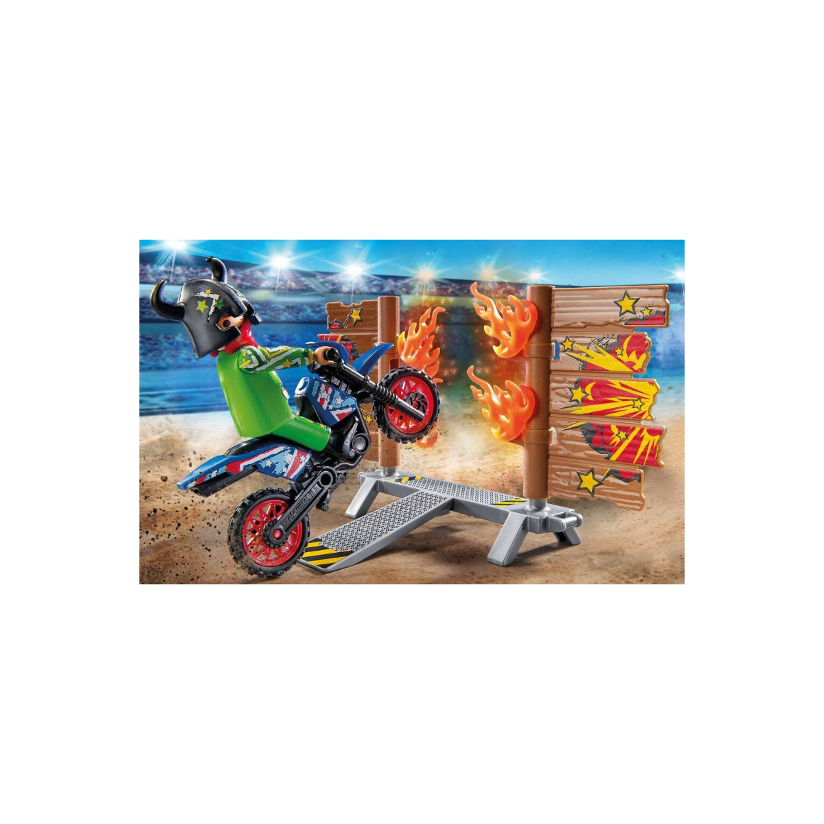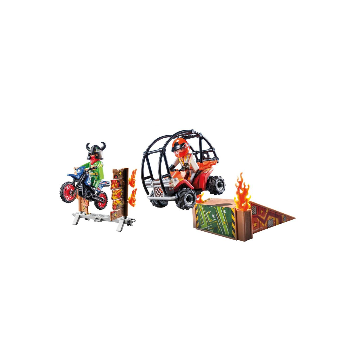Un set Playmobil lleno de adrenalina con moto, quad de arrastre y rampas de fuego para crear acrobacias espectaculares y horas de juego imaginativo sin límites.