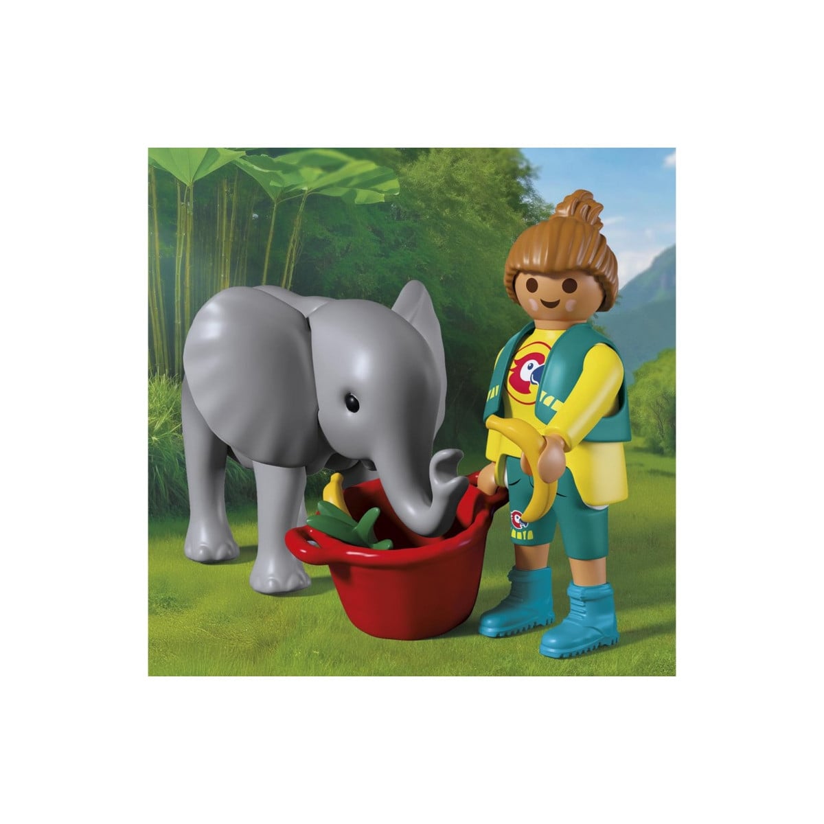 Con esta propuesta, Playmobil acerca a niñas y niños al trabajo diario que se realiza en los zoológicos para cuidar y proteger a los animales. El elefante bebé se convierte en el protagonista de la escena, mientras la cuidadora supervisa su espacio, le da alimento o simplemente pasa tiempo con él para garantizar que se adapte correctamente a su hábitat.