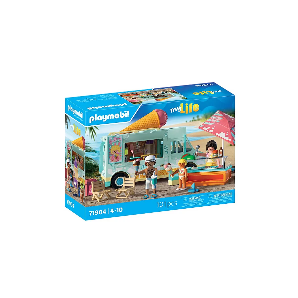 - Figuras incluidas en el set: 1 mujer, 1 hombre con gorra, 1 niña, 1 pájaro, 1 camión con gran cono de helado en el techo, 1 mostrador de helados con helado de fresa, chocolate y vainilla, 1 vaso con tapa, 1 tubo, 1 vaso con pajita, 2 conos de helado con varias bolas de helado enchufables, 1 tabla de surf, 1 remo, 2 aletas, 2 gafas de buceo con tubo, 3 cajas de fruta, 1 sombrilla, 2 sillas plegables, 1 papelera, 1 velero de juguete, 1 dispensador de bolas de helado.