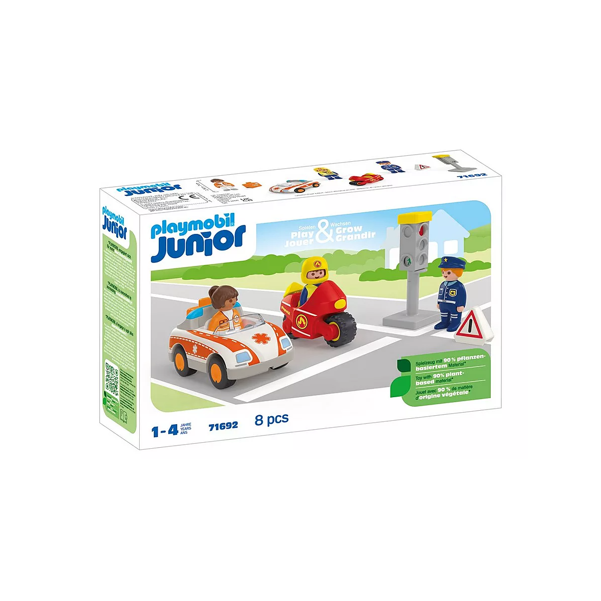 El set incluye un médico, un bombero y un policía, junto con sus vehículos y accesorios, como una moto de bomberos, un coche médico de emergencia, un semáforo ajustable y un triángulo de advertencia. Los niños podrán crear historias mientras exploran el trabajo en equipo y los valores de ayuda y seguridad.
