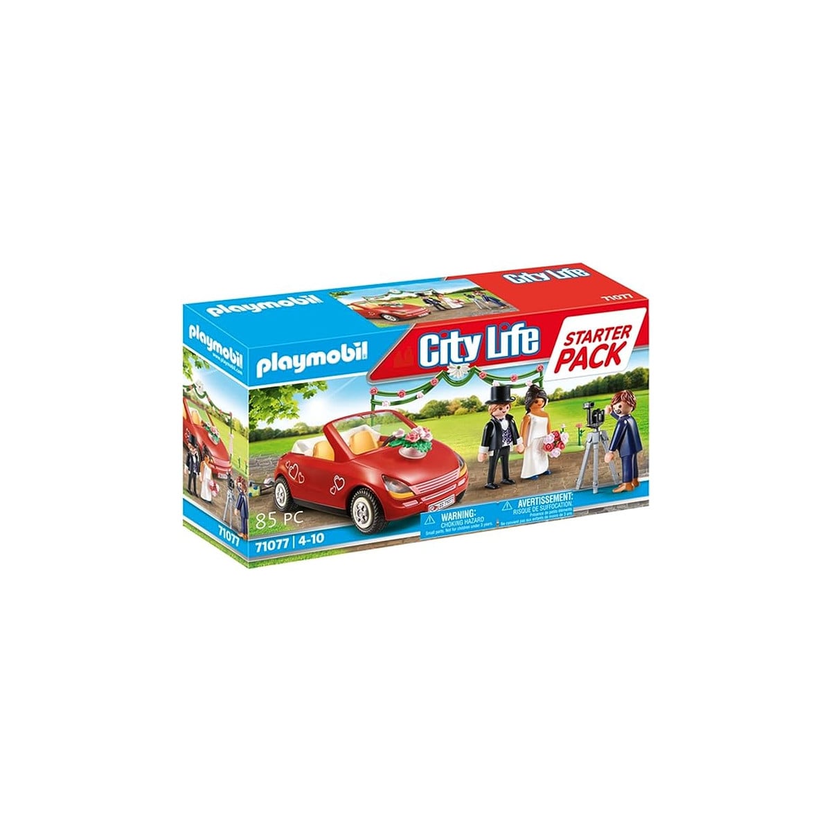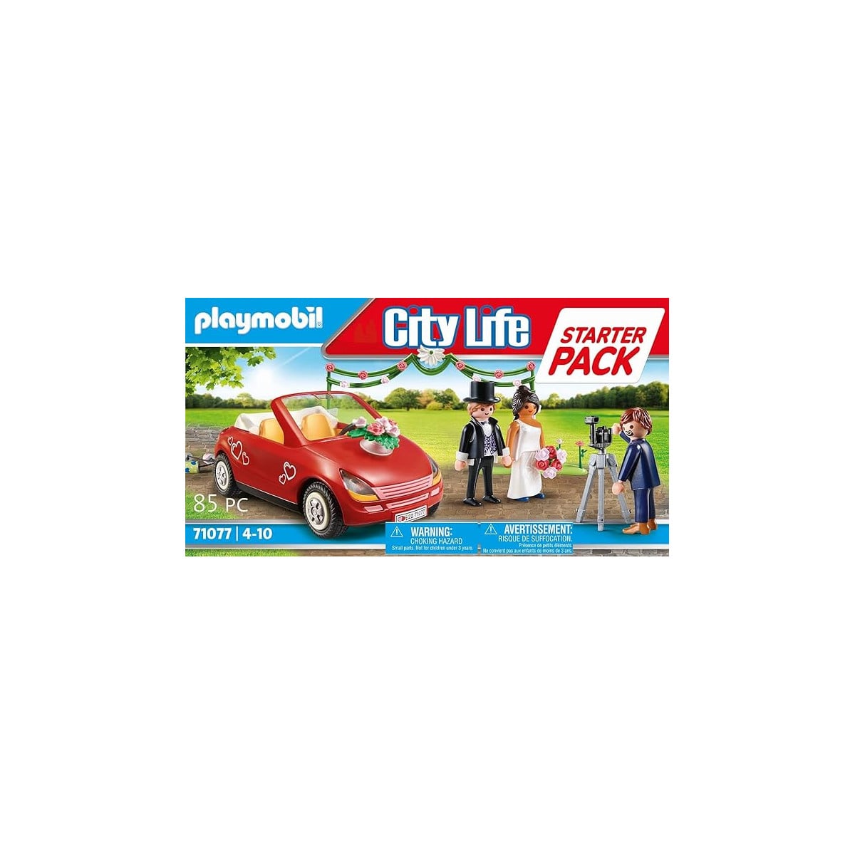 - Incluye: 3 figuras Playmobil, 1 arco de decoración floral, 1 cámara de fotos y 1 coche descapotable rojo.