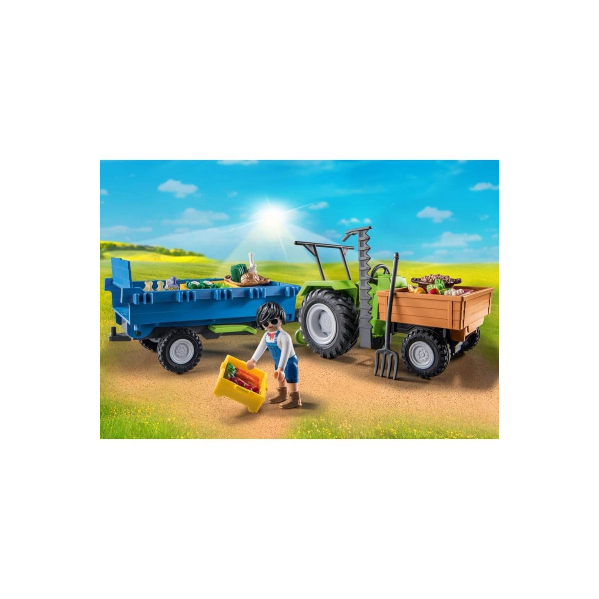 - Incluye: 1 figura Playmobil, 1 tractor, 1 remolque, 13 pequeñas hortalizas, 4 cajas de fruta, 2 cestos, 4 bolsas de semillas y 1 herramienta.