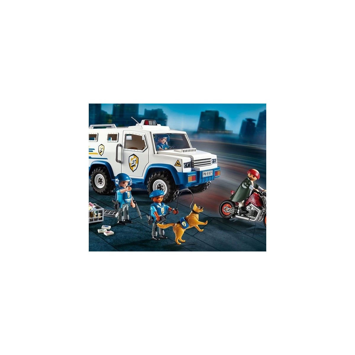 - Incluye accesorios, una moto, un perro policía, armas y por supuesto el vehículo blindado