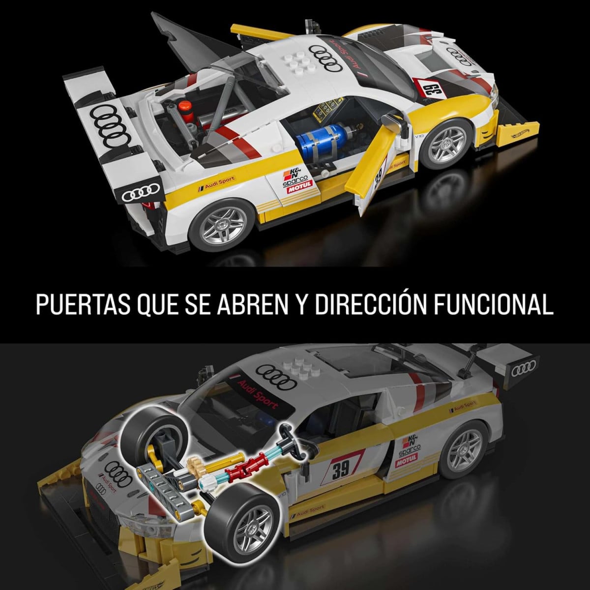 Este set destaca por su acabado realista, con elementos como puertas que se abren, interior detallado y un diseño inspirado en competición. Además, incluye pegatinas para personalizar el coche y diferentes accesorios que permiten ajustar pequeños detalles, haciendo que cada montaje sea único y más completo.